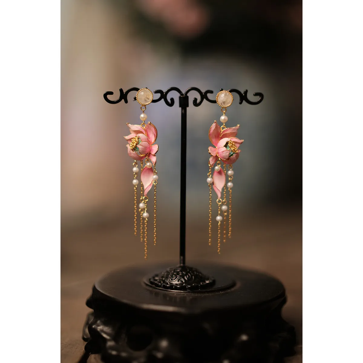 衣都精品- 新款鎏金仿點翠花絲燒藍鑲嵌珍珠荷花耳環