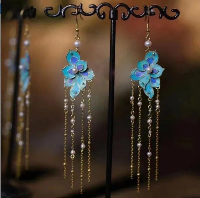 衣都精品- 新款鎏金仿點翠花絲流蘇貝珠燒藍牡丹耳環
