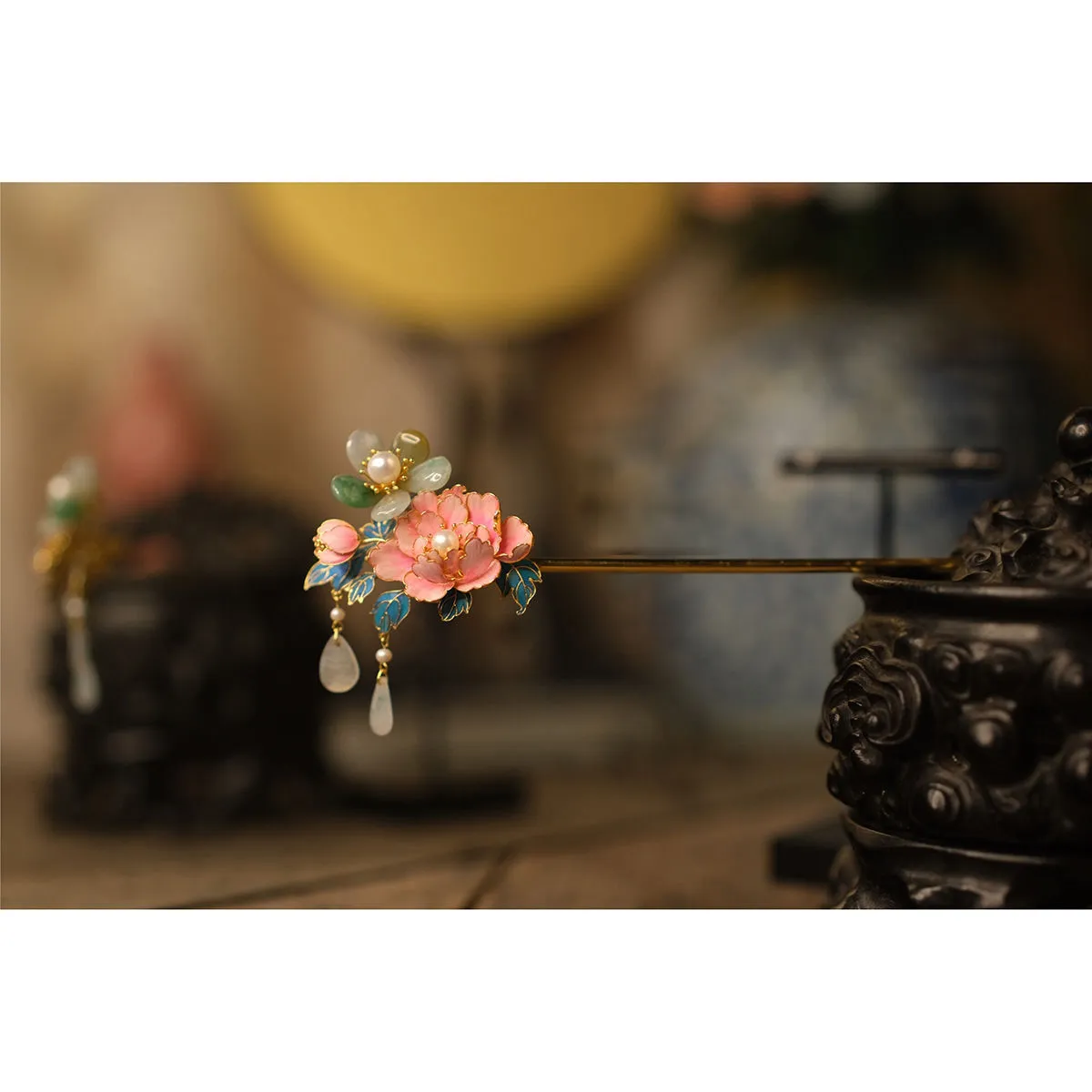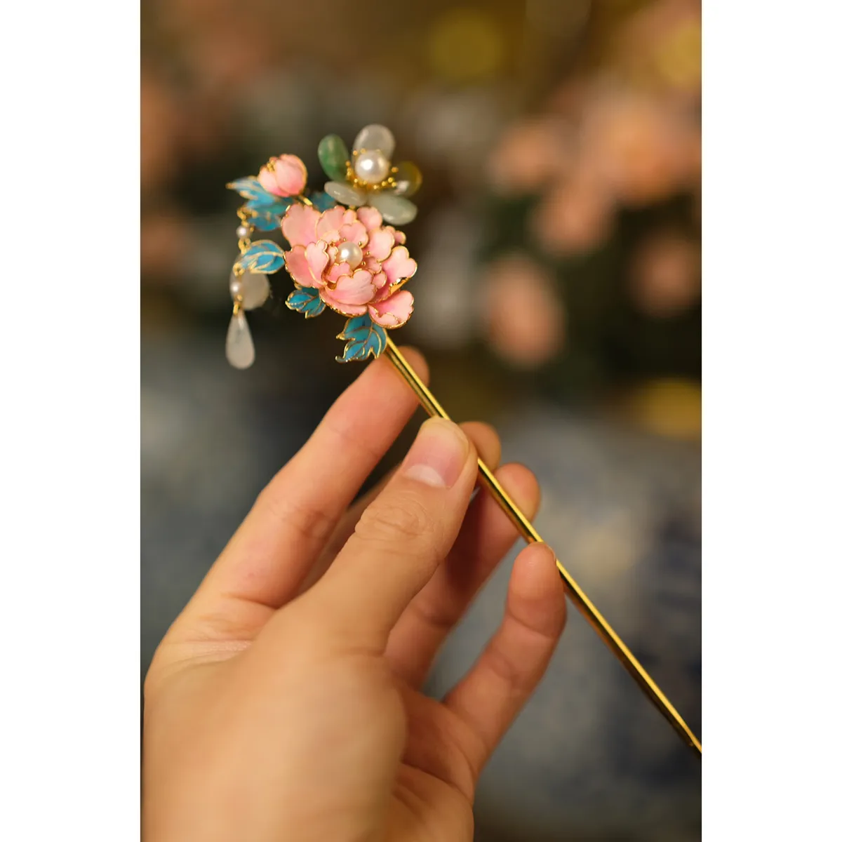 衣都精品- 新款鎏金仿點翠花絲燒藍牡丹珍珠髮簪