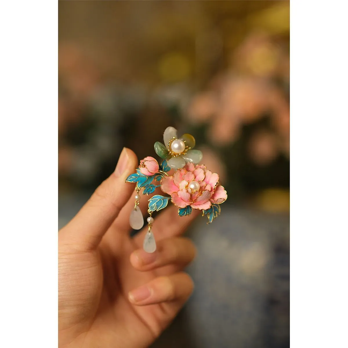 衣都精品- 新款鎏金仿點翠花絲流蘇貝珠燒藍牡丹耳環