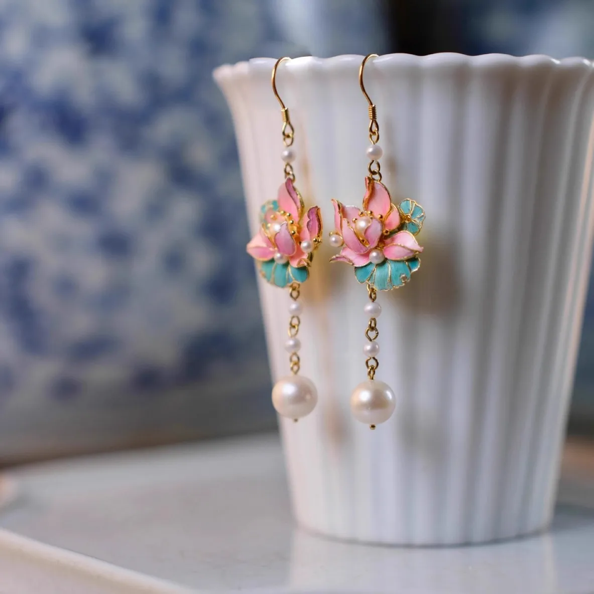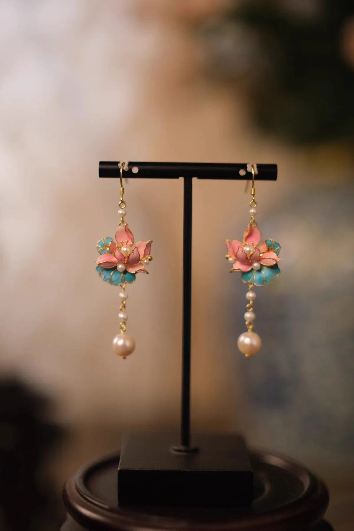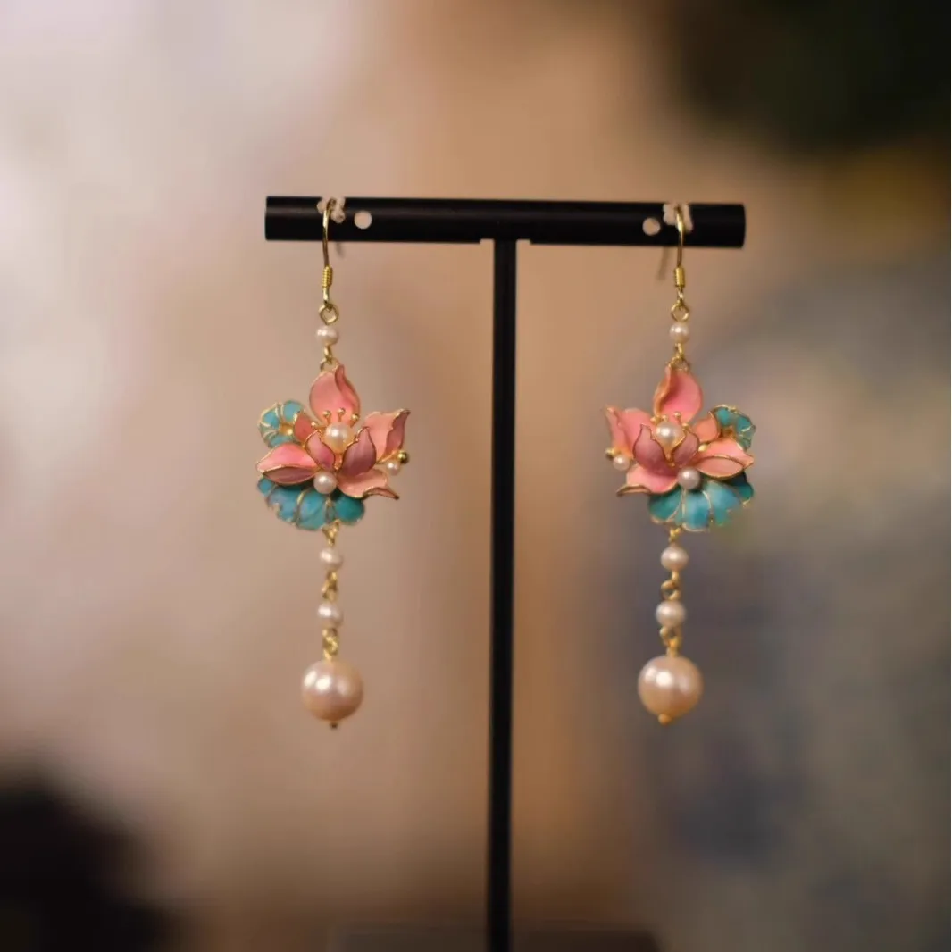 衣都精品- 新款仿點翠花絲荷花珍珠耳環