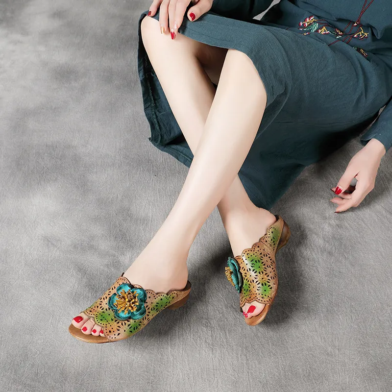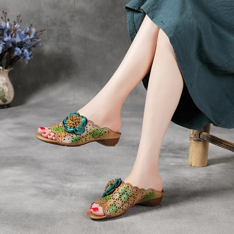 衣都精品- 新款民族風鏤空手工復古真皮拖鞋