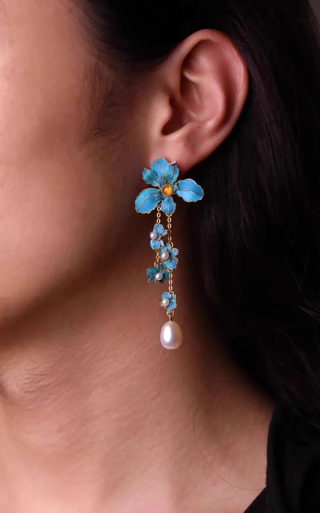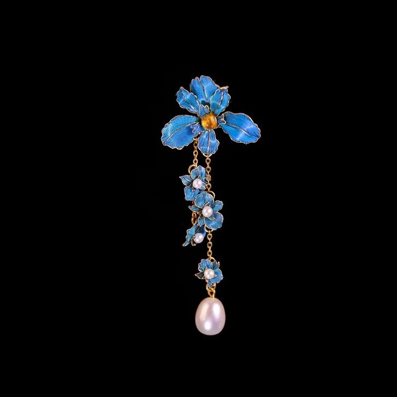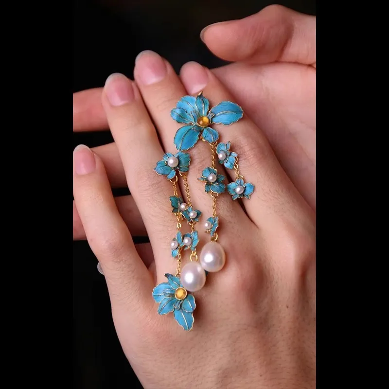 衣都精品- 新款復古仿點翠燒藍鳶尾花流蘇耳環