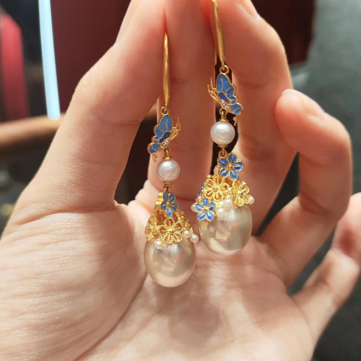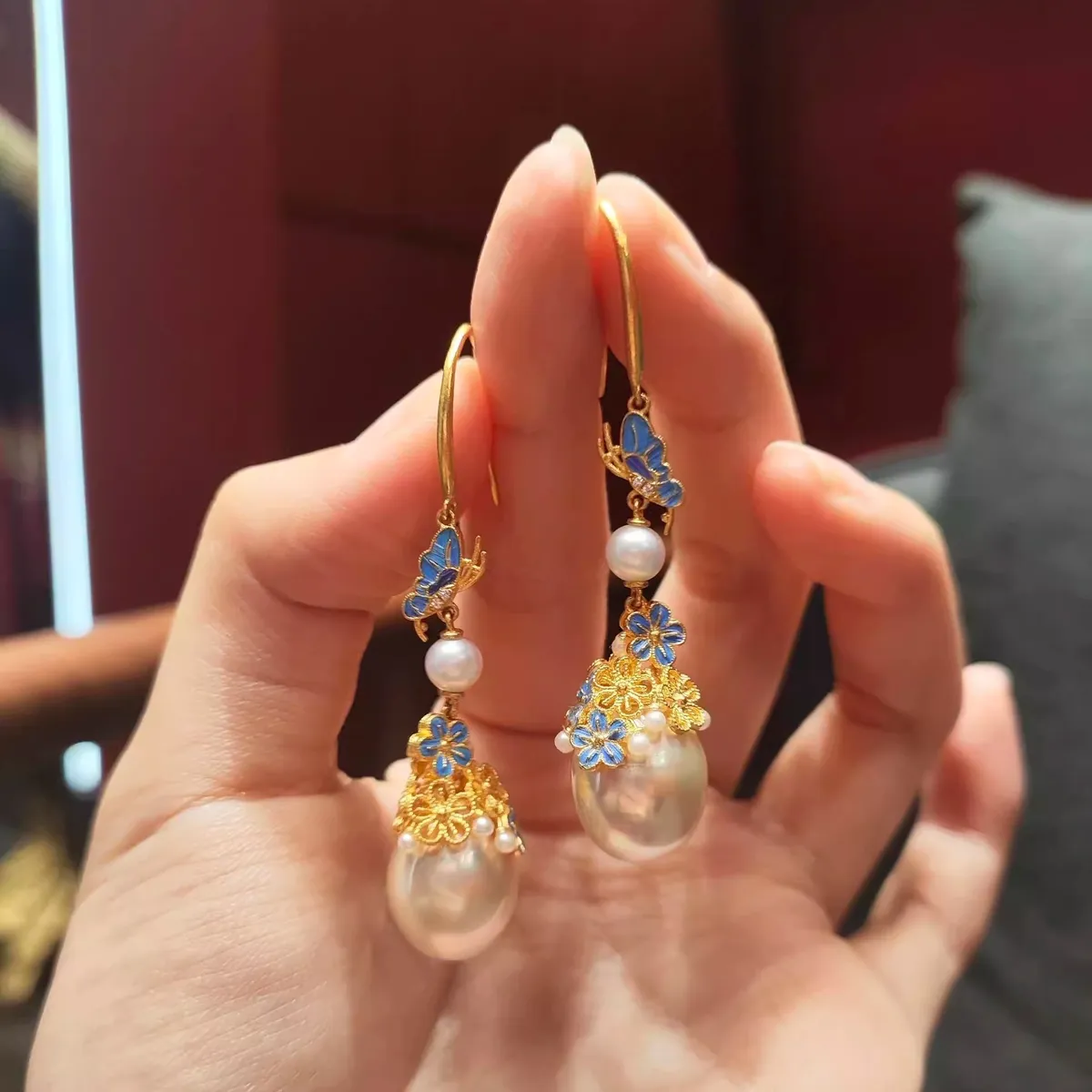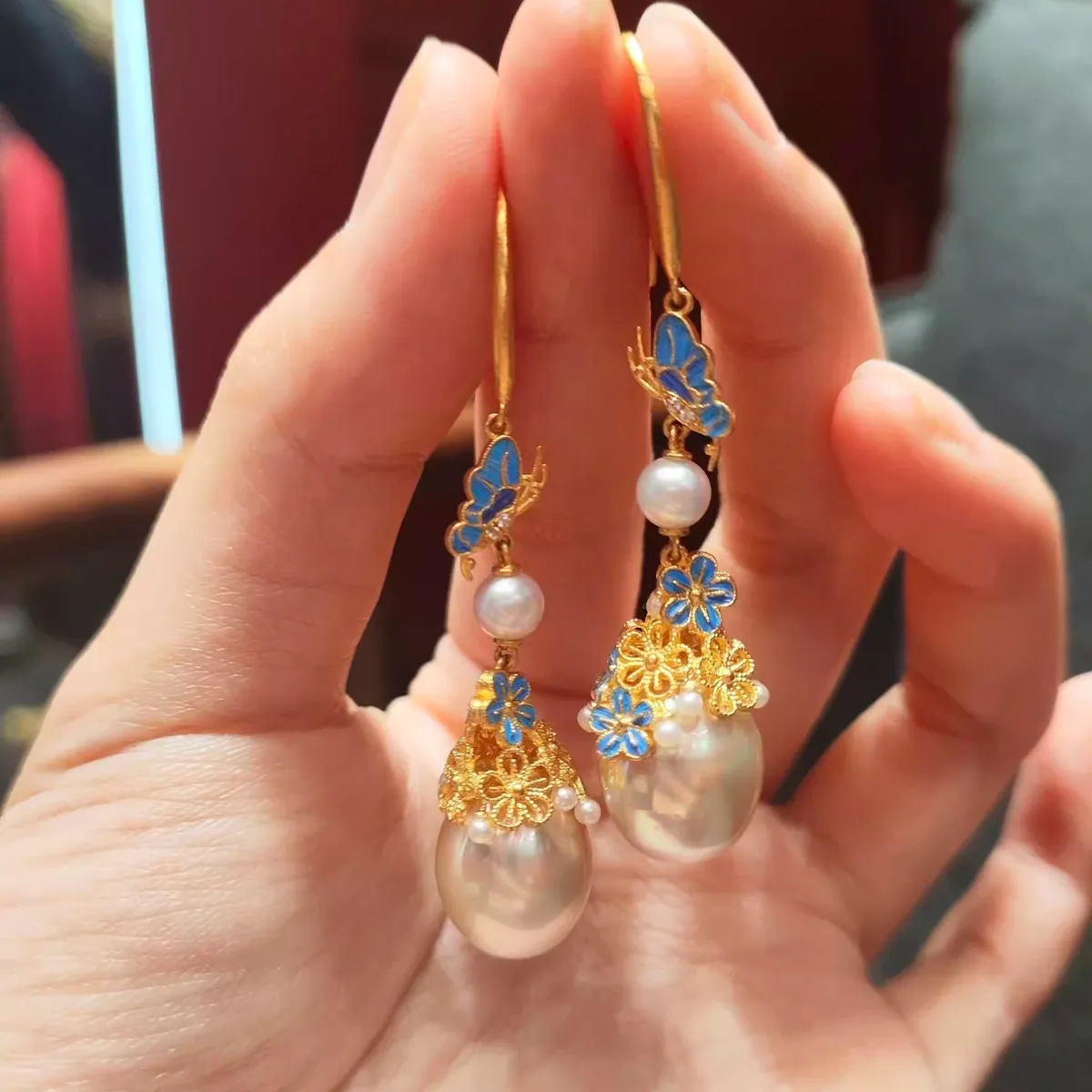 衣都精品- 新款中式仿點翠花絲鑲嵌珍珠耳環