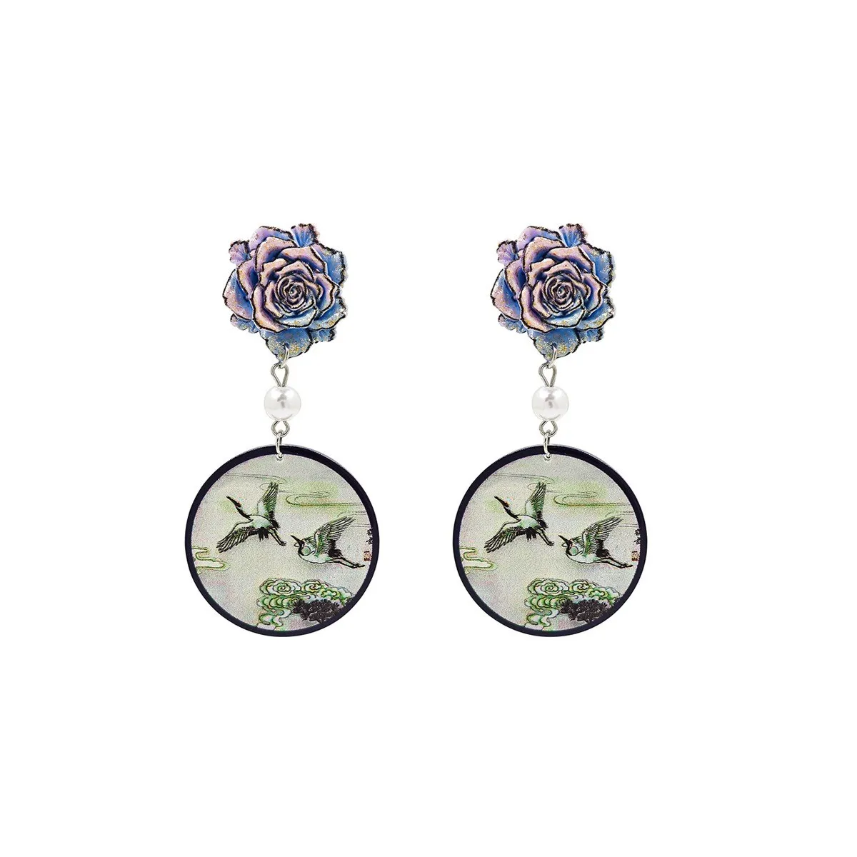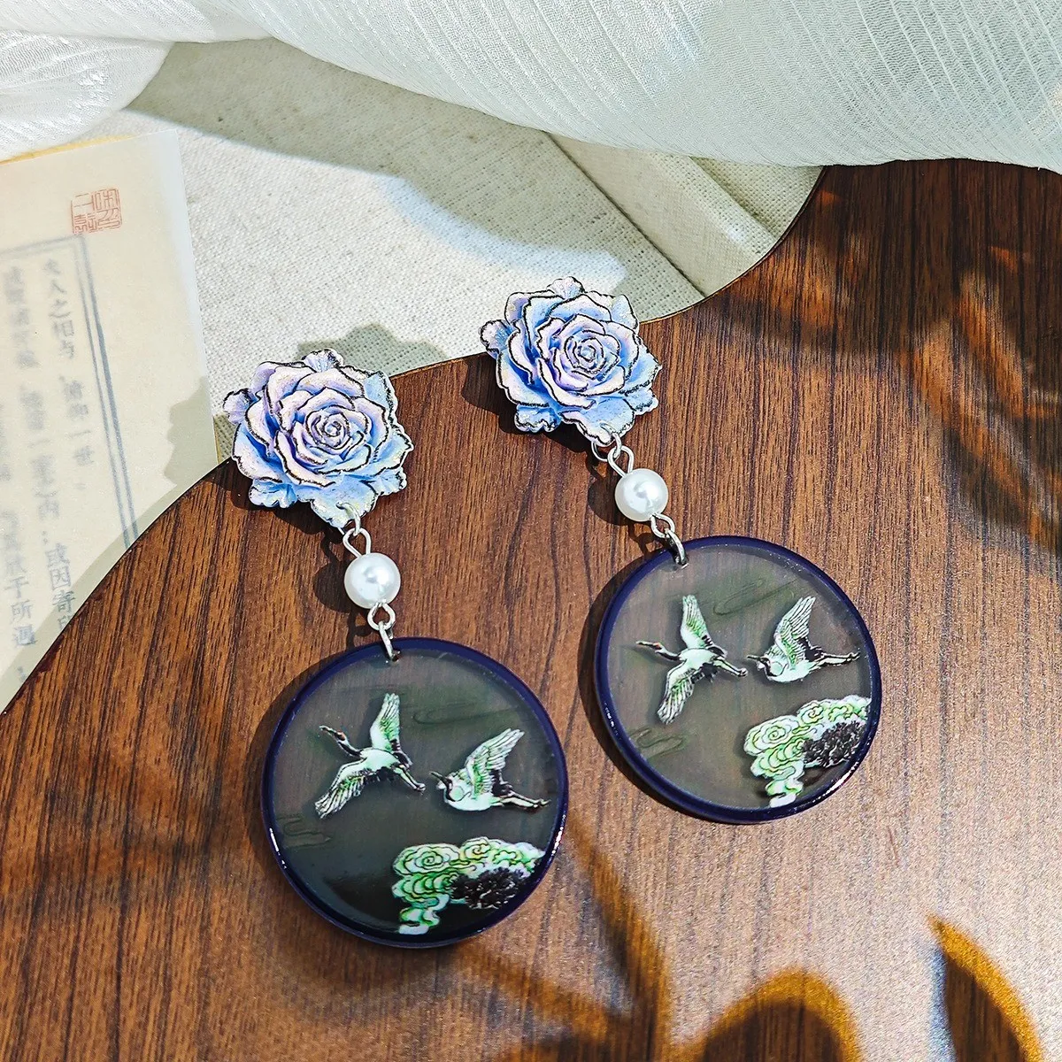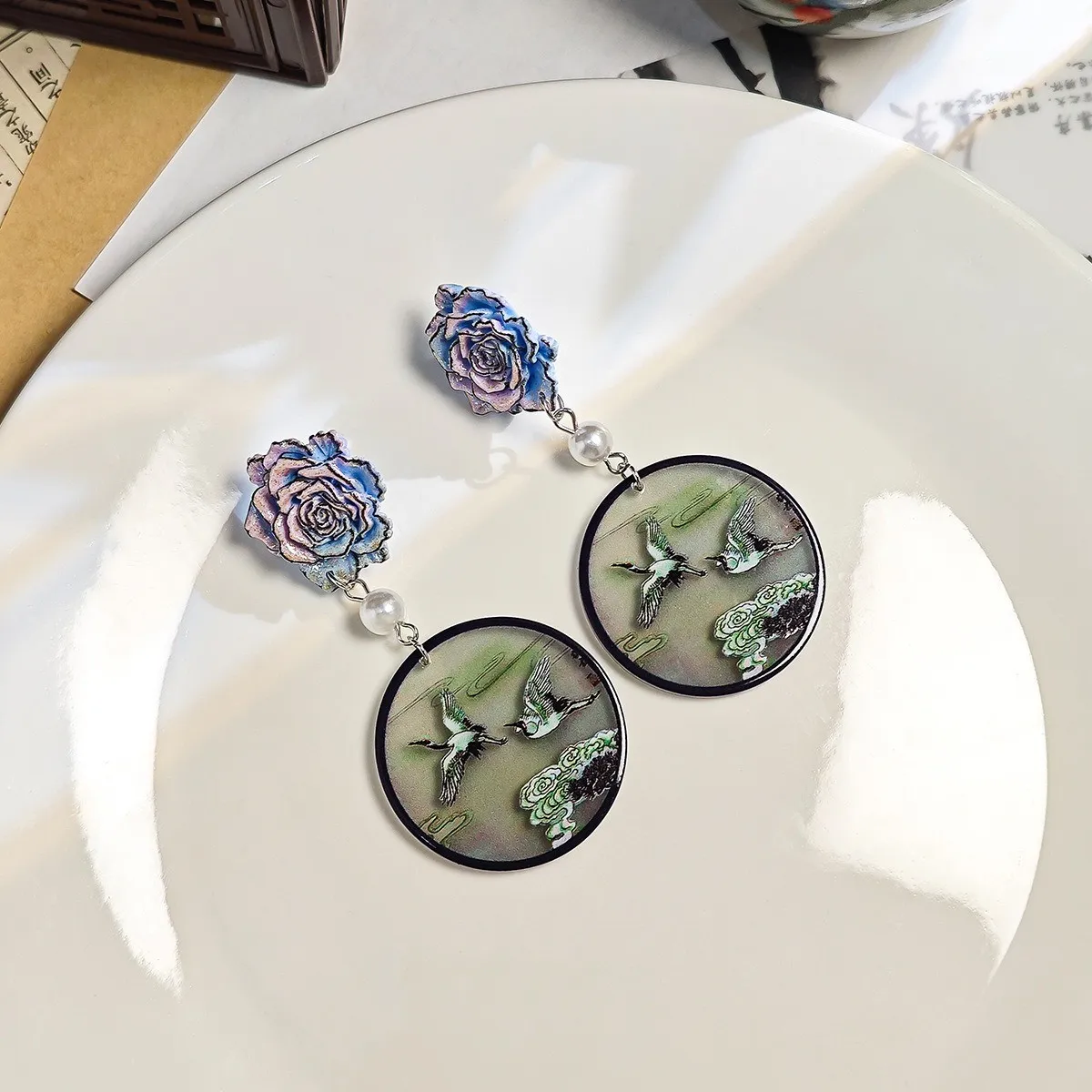 衣都精品- 新款銀針復古幾何圓形仙鶴耳環