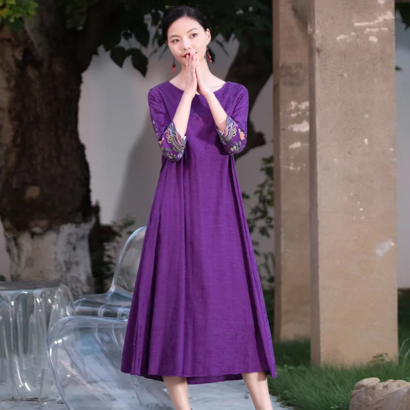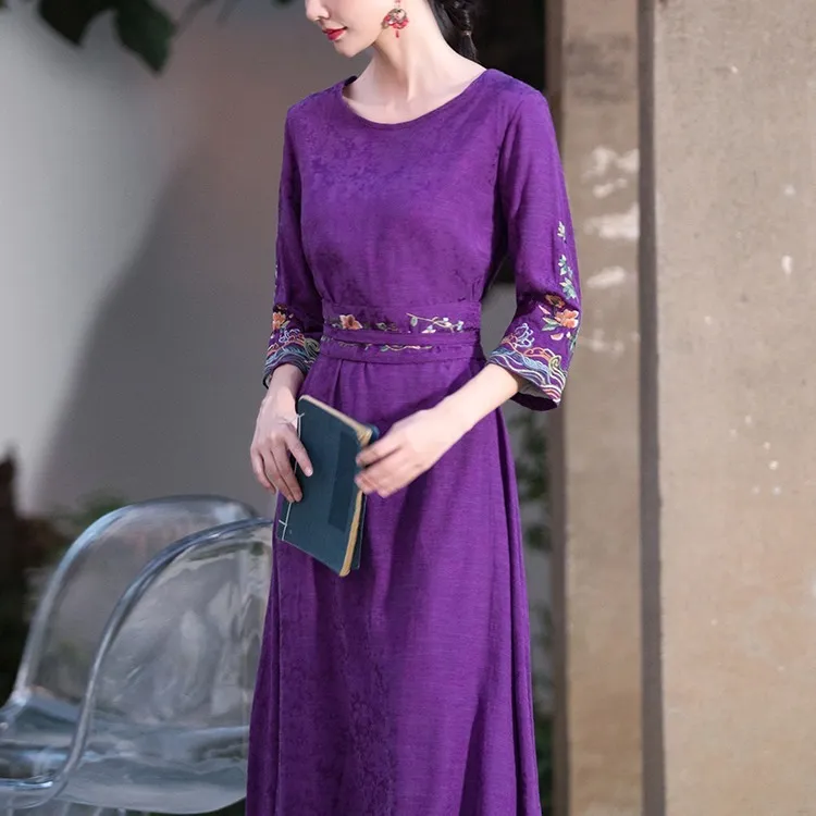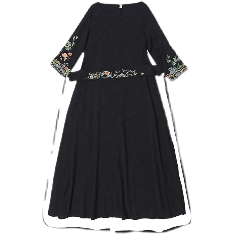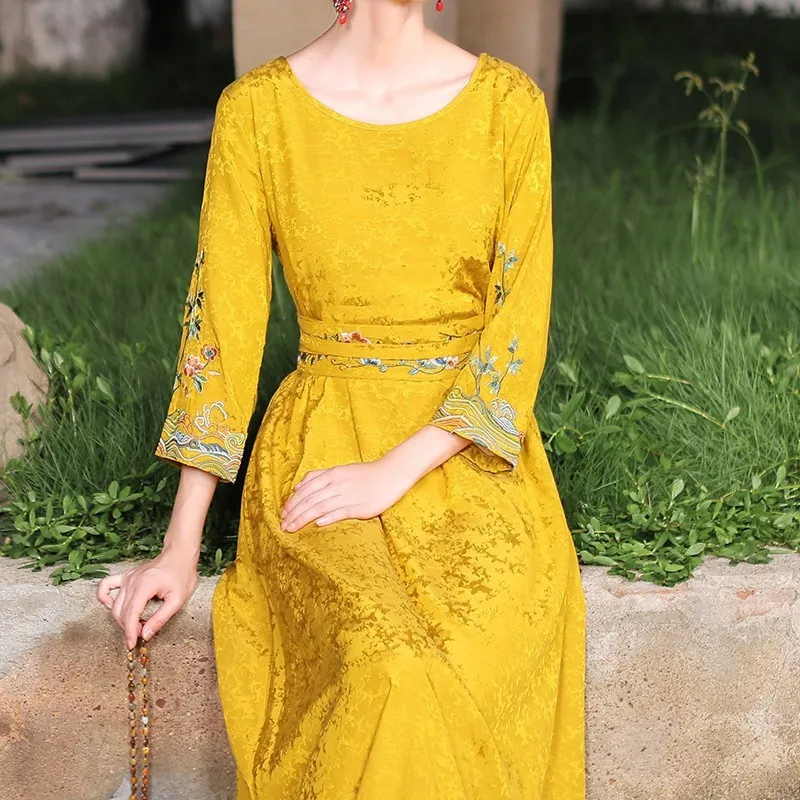 衣都精品- 2022春季新款緞面圓領重工繡花連衣裙