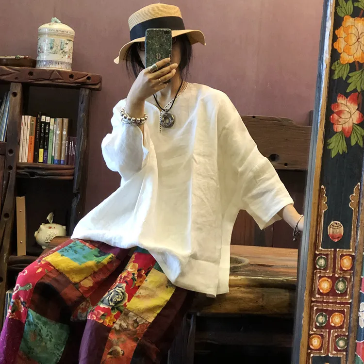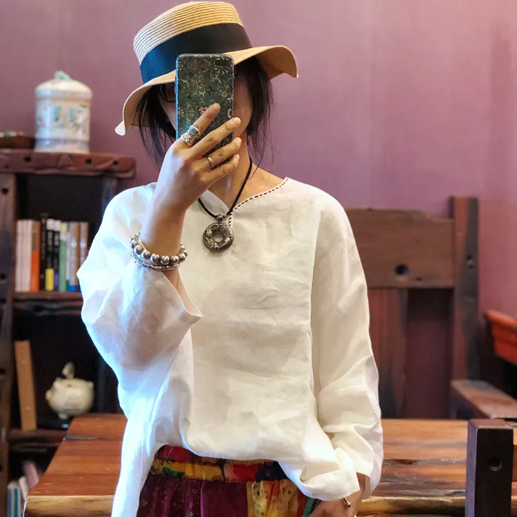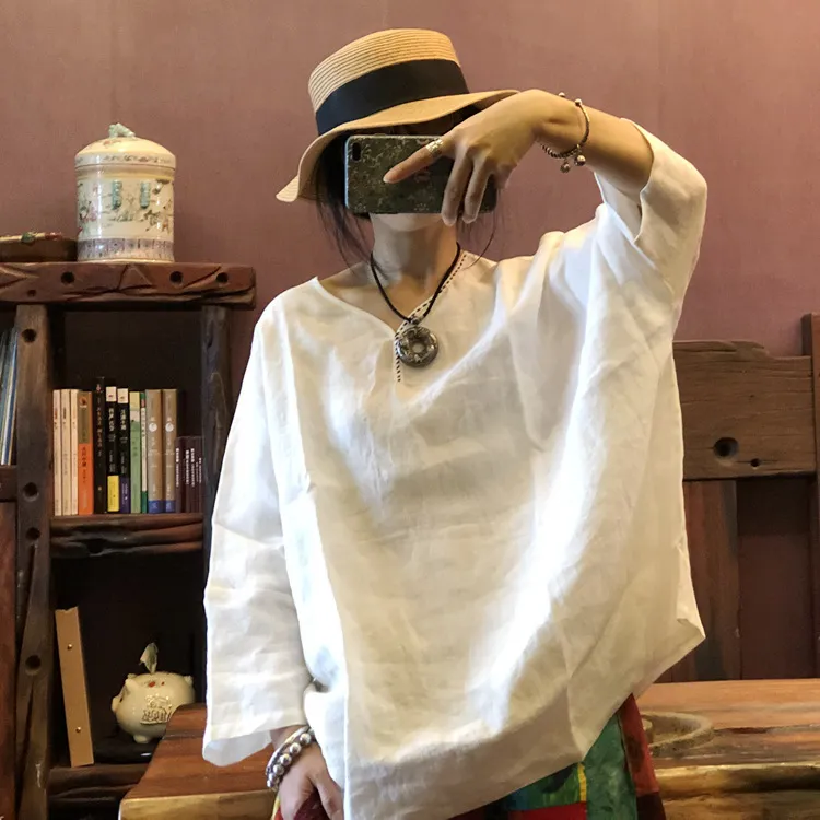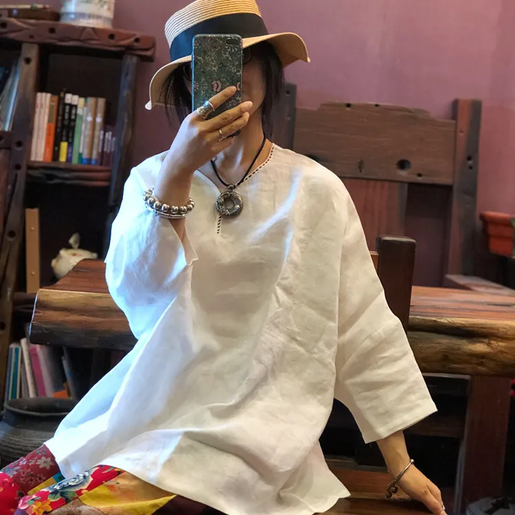衣都精品- 2022春夏新款純亞麻手工針線領口蝙蝠袖上衣