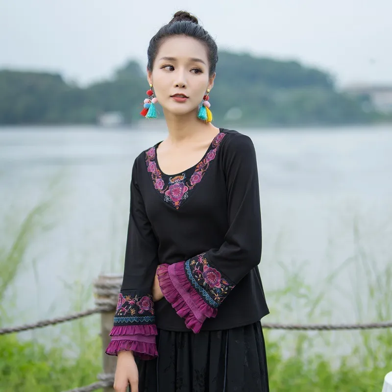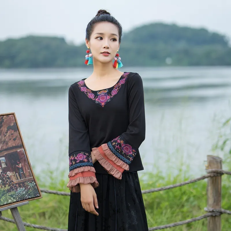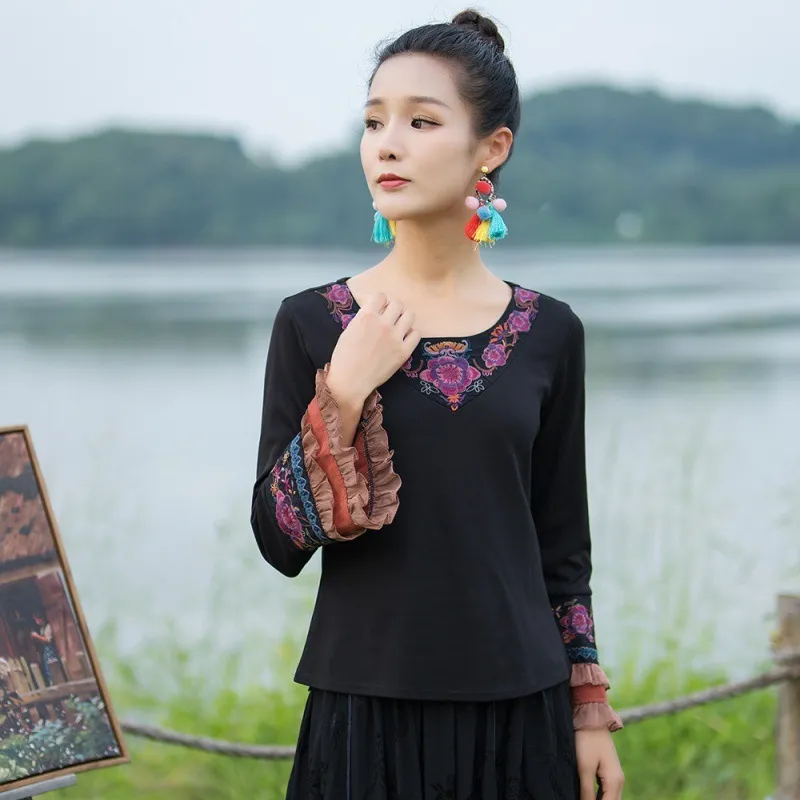 衣都精品- 2022秋季新款民族風繡花圓領拼接上衣