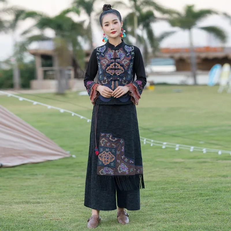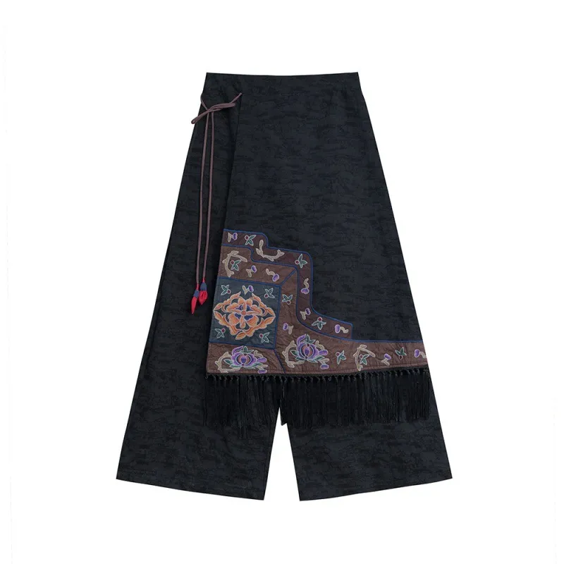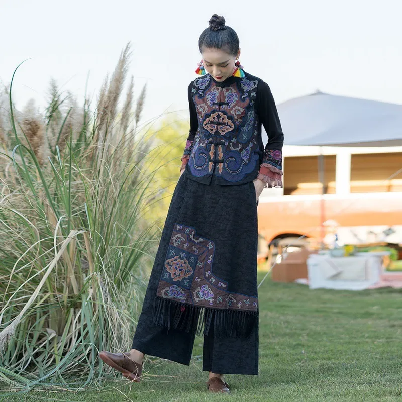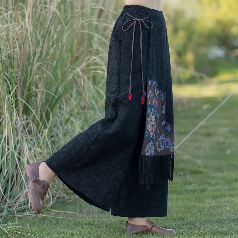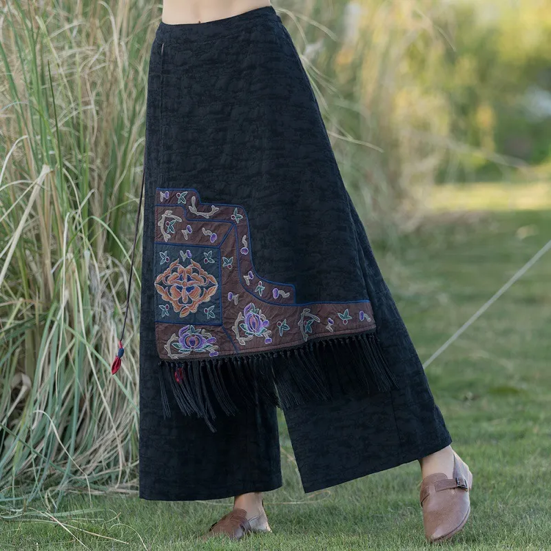 衣都精品- 2022冬季新款民族風貼布刺繡流蘇闊腿褲