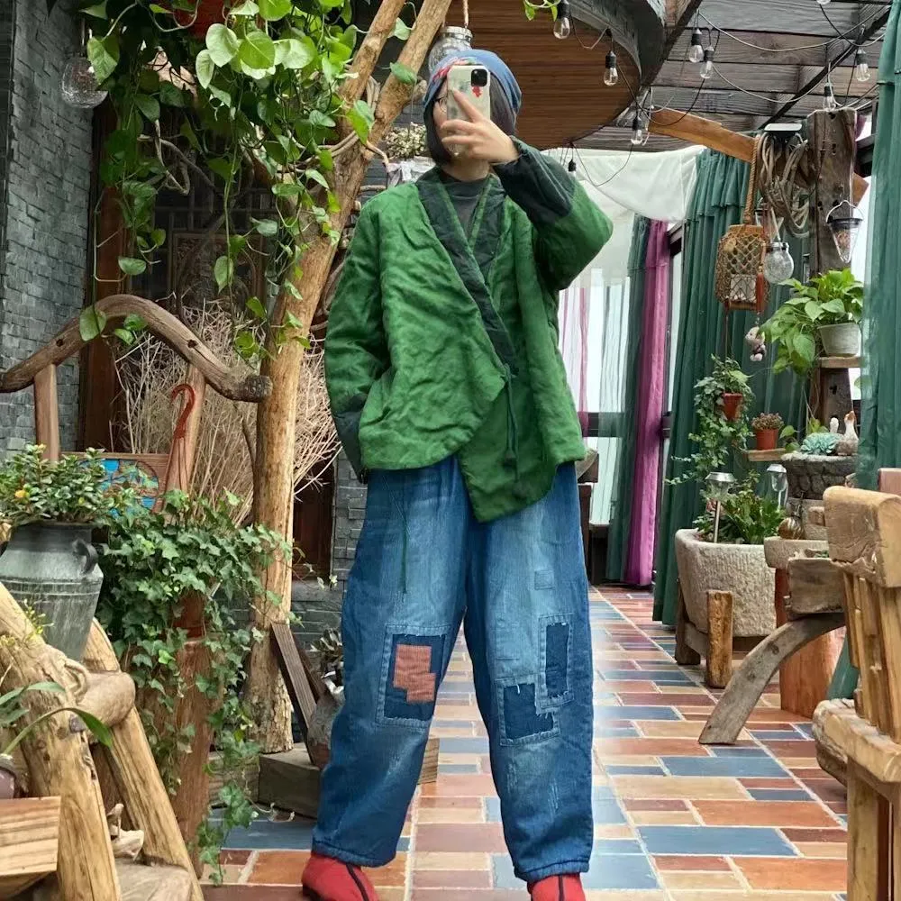 衣都精品- 2022冬季新款民族風寬鬆刺繡V領盤扣牛仔外套