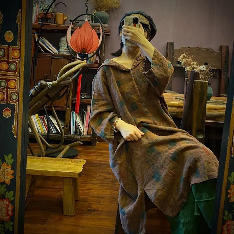 衣都精品- 2022冬季新款做舊雪花洗仿香雲紗印花連衣裙