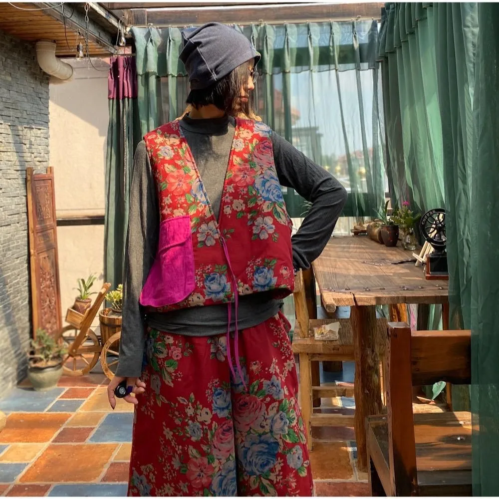 衣都精品- 2022冬季新款寬鬆繫帶復古紅大花撞色外套