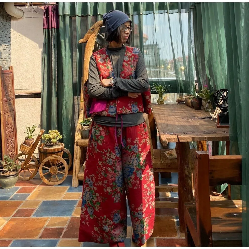 衣都精品- 2022冬季新款復古大花文藝寬鬆鬆緊腰闊腿褲