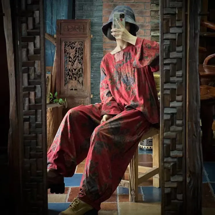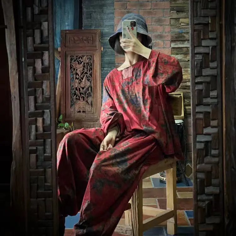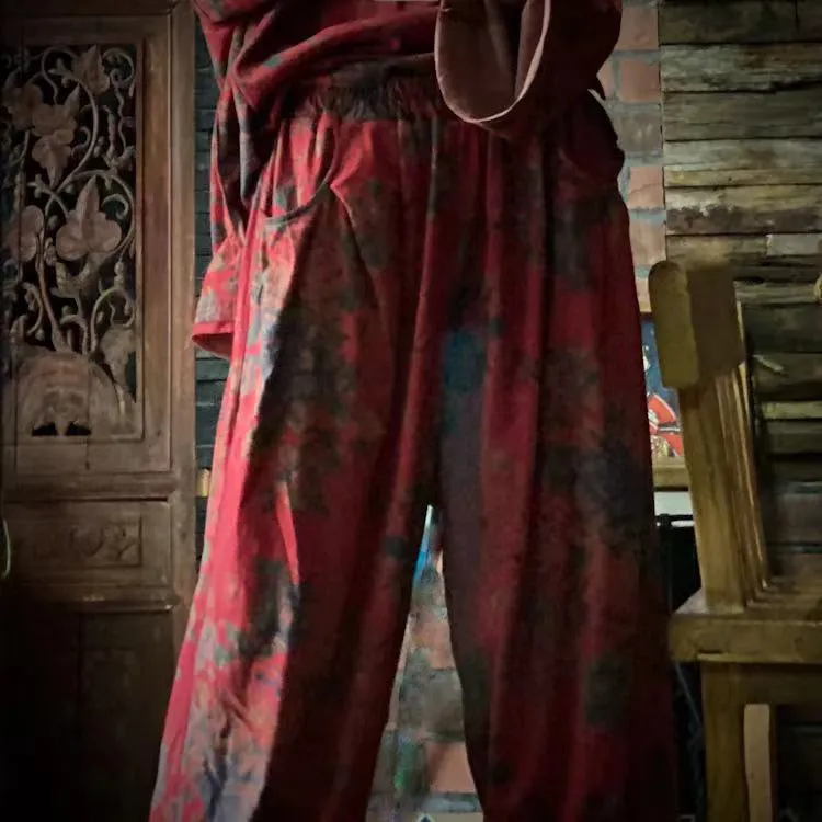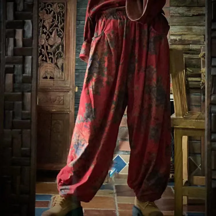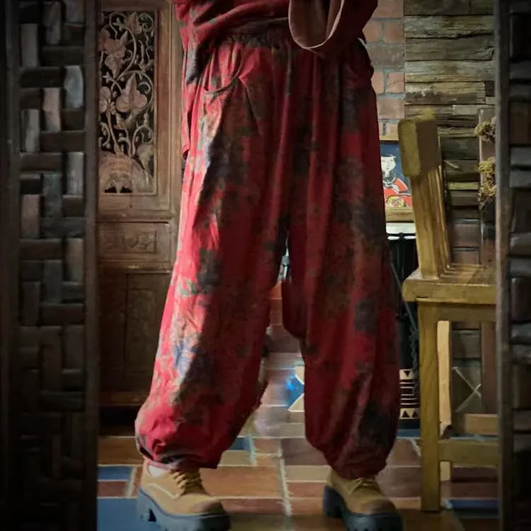 衣都精品- 2022冬季新款復古大花文藝寬鬆鬆緊腰闊腿褲