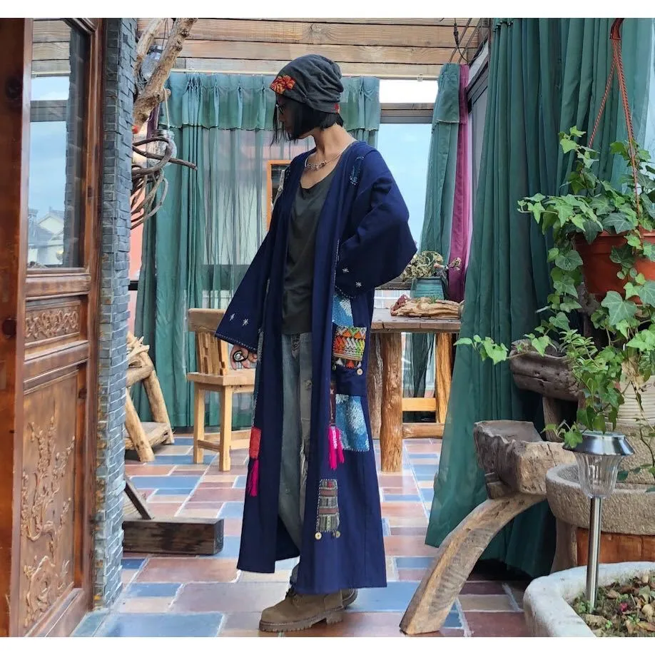 衣都精品- 2022冬季新款復古刺繡貼布寬鬆V領連衣裙