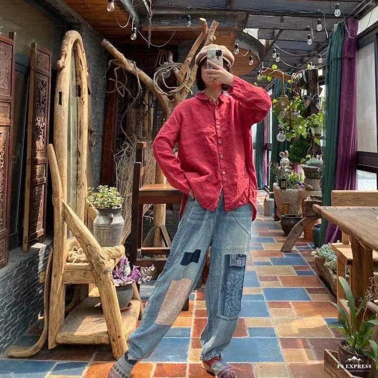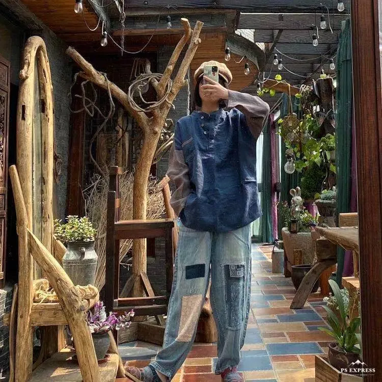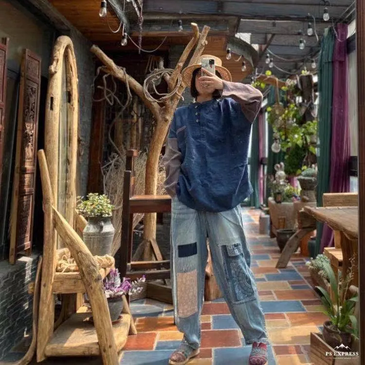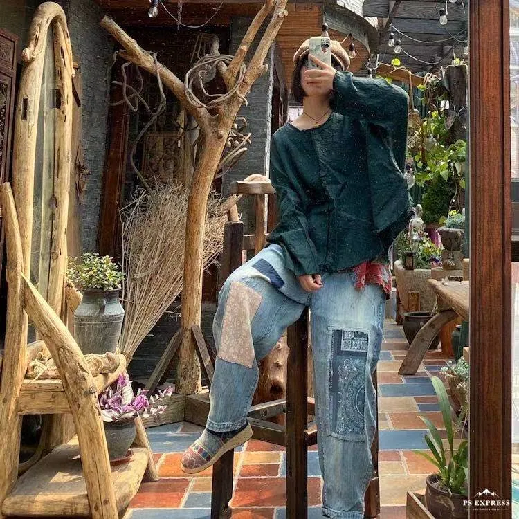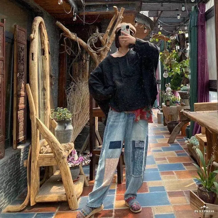 衣都精品- 2022冬季新款復古文藝吊襠補丁九分褲