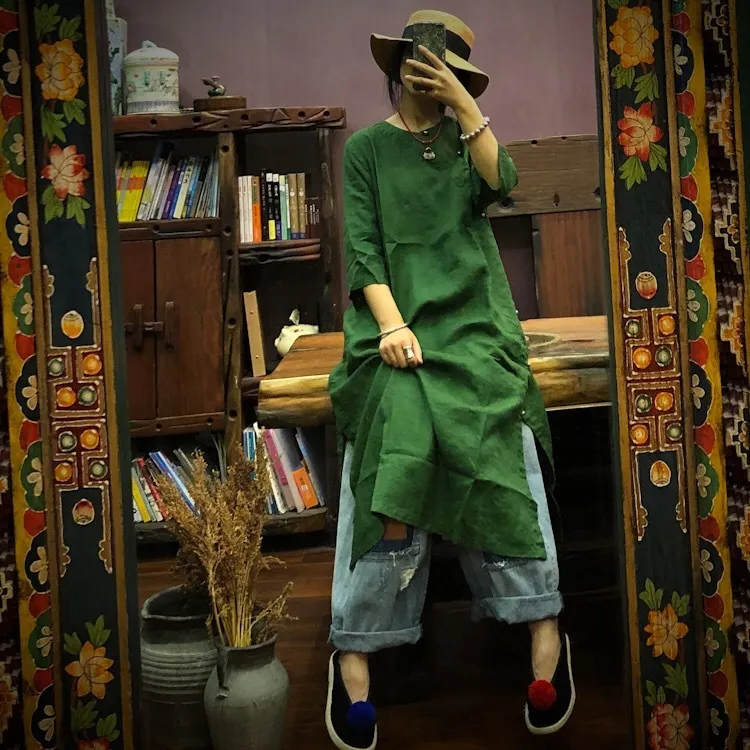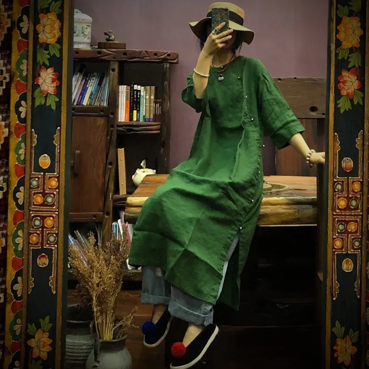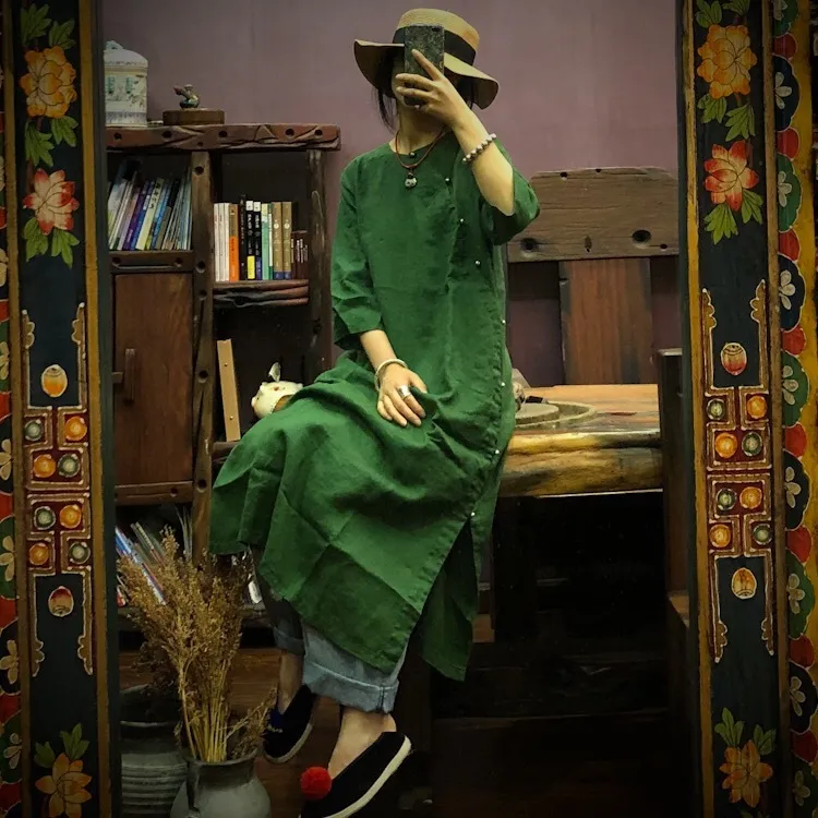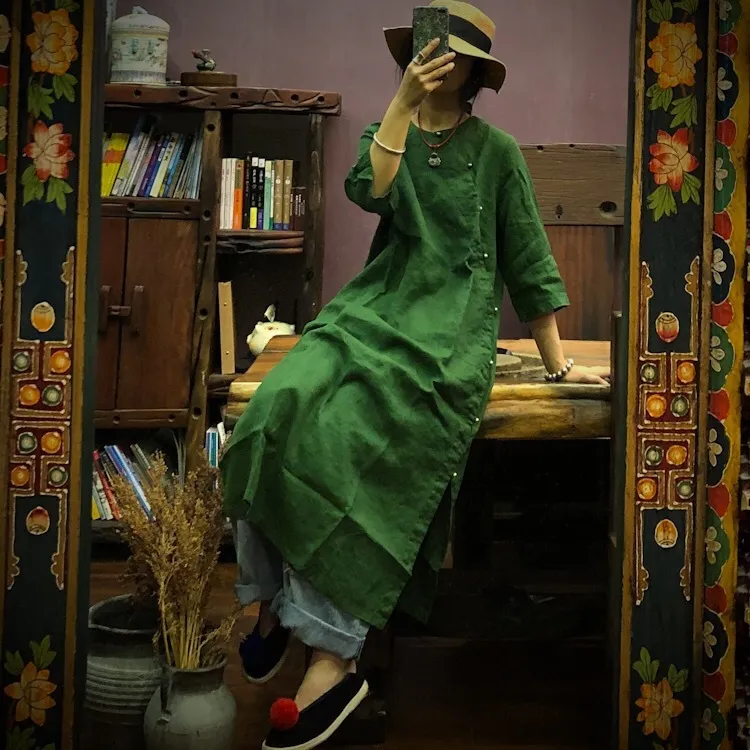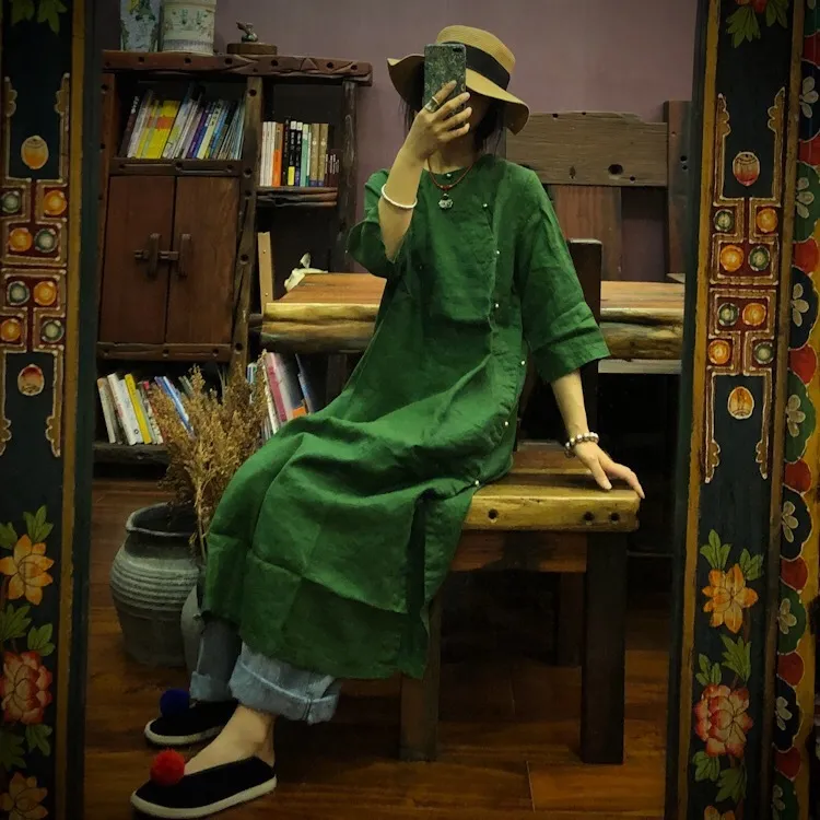 衣都精品- 2023新款純亞麻水洗銀扣七分袖斜襟連衣裙