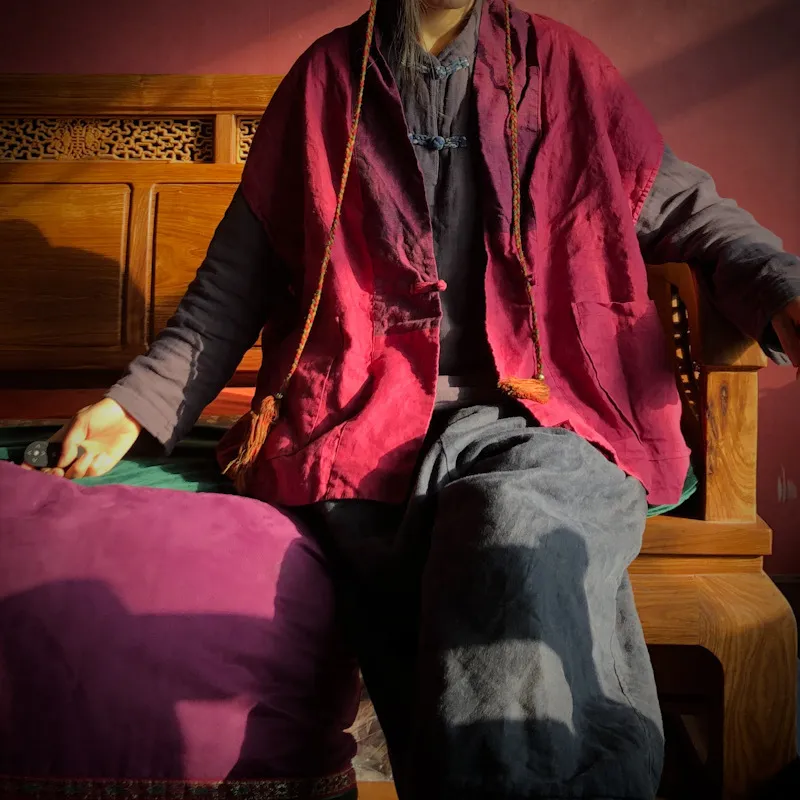 衣都精品- 2023新款純亞麻水洗撞色寬鬆坎肩外套