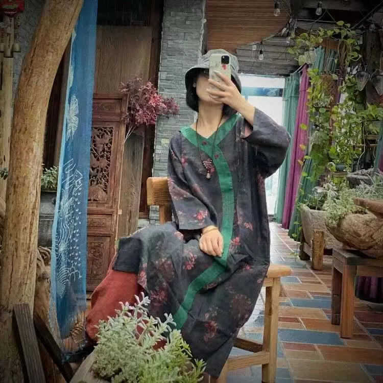 衣都精品- 2023新款純亞麻水洗銀扣七分袖斜襟連衣裙