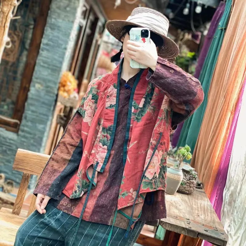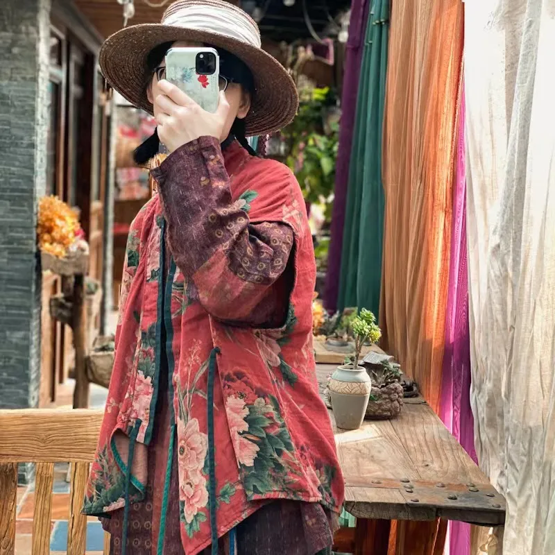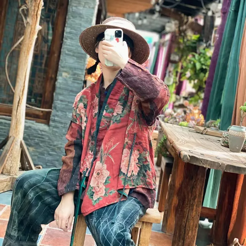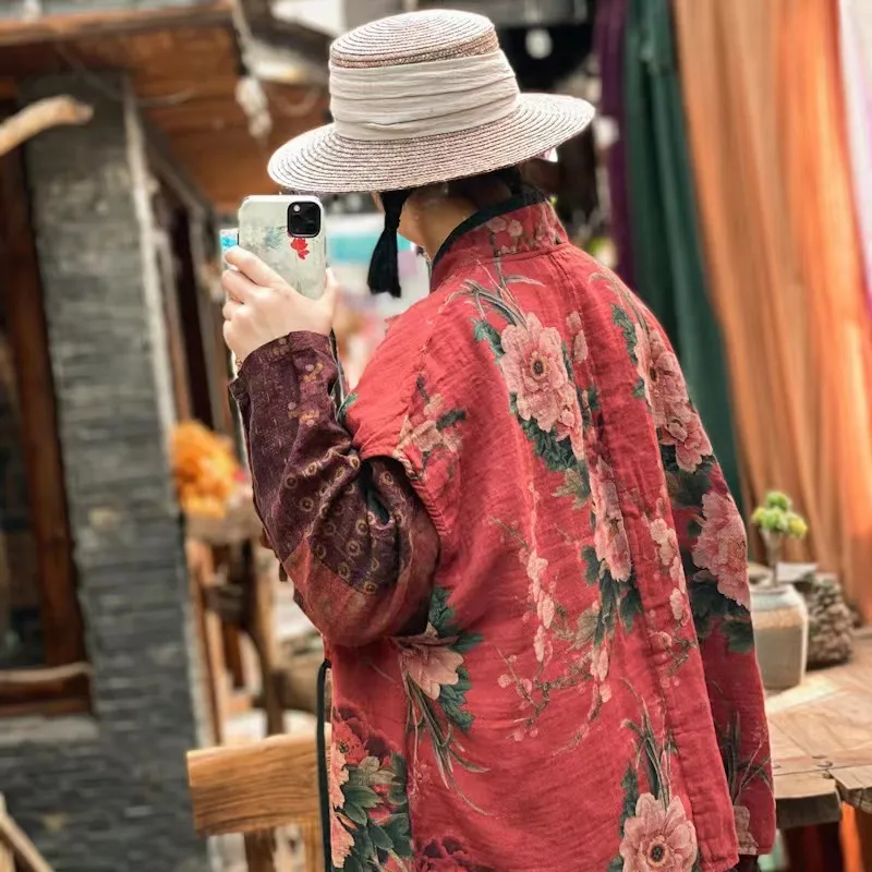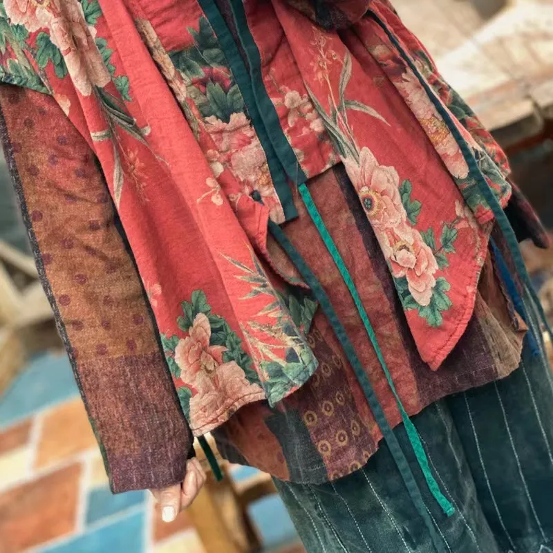 衣都精品- 2023新款雙層棉紗寬鬆印花繫帶外套