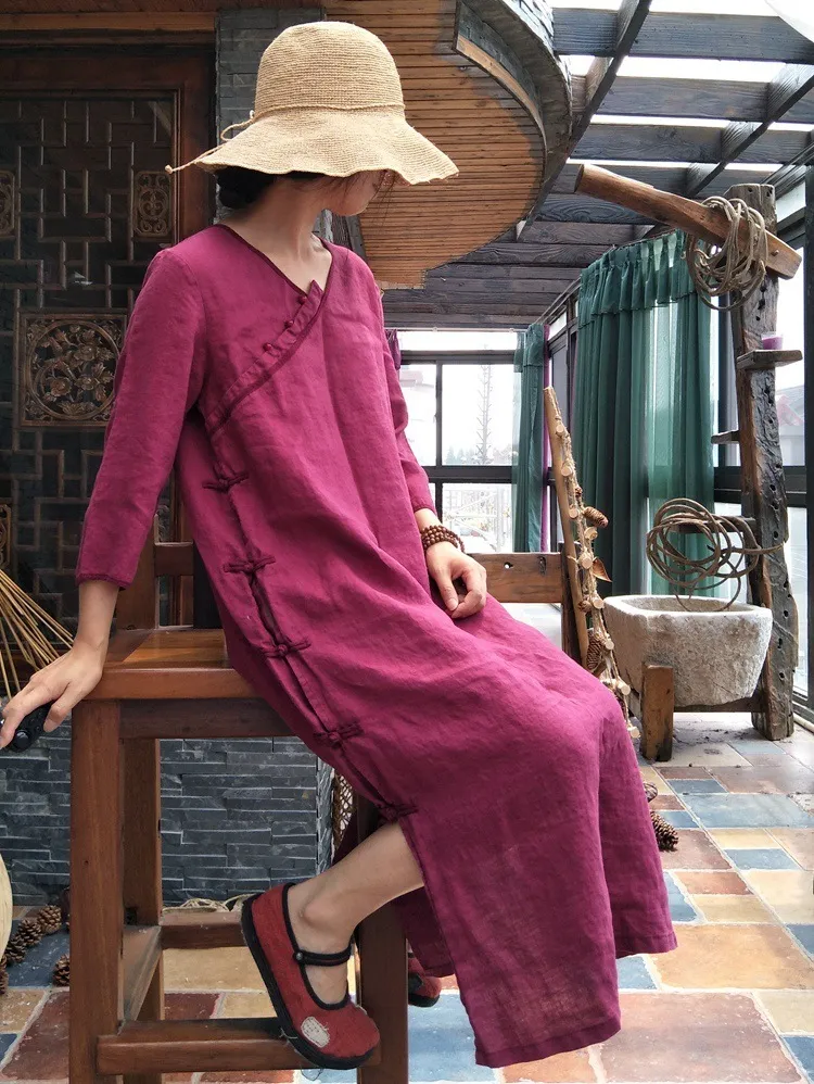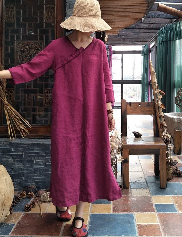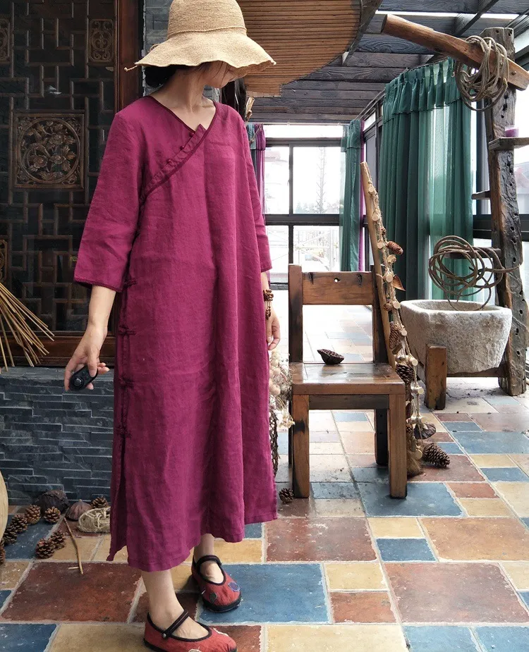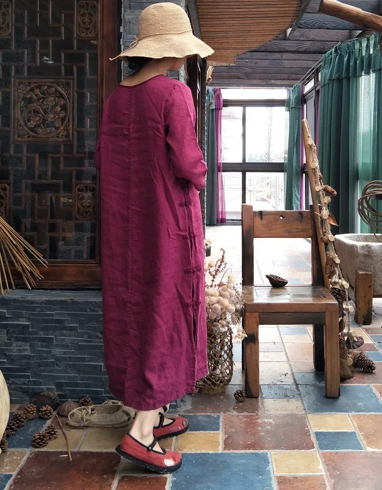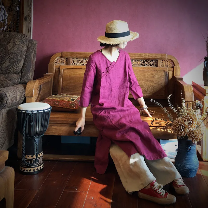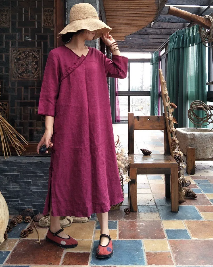 衣都精品- 2023新款民族風純亞麻水洗玉扣連衣裙