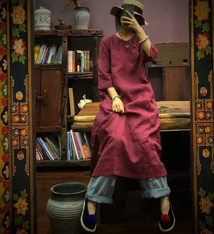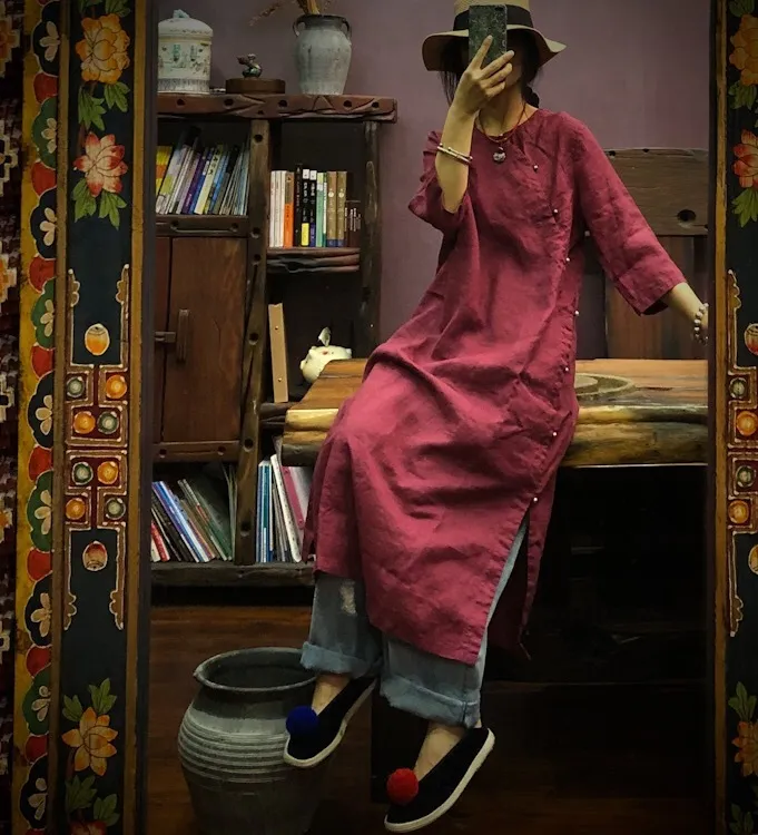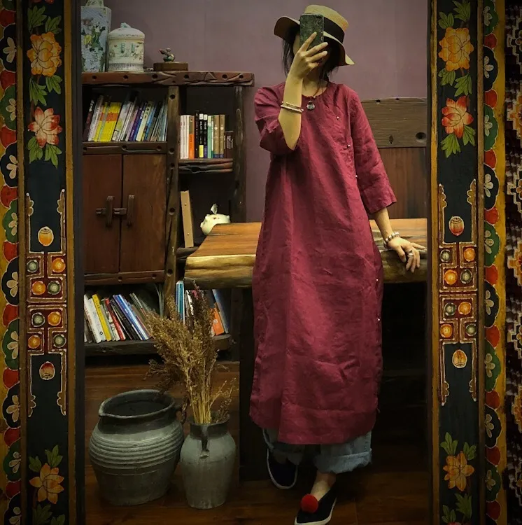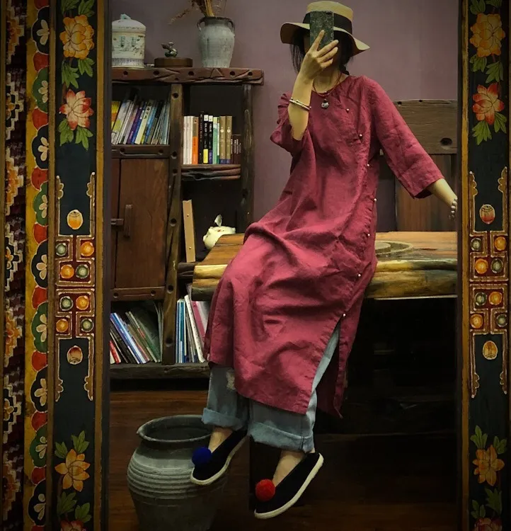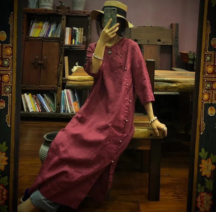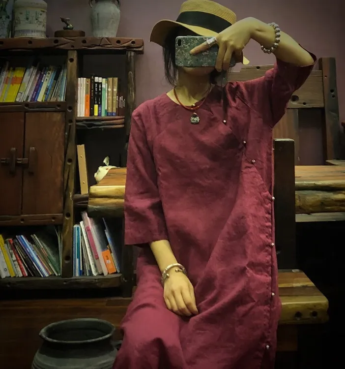 衣都精品- 2023新款民族風純亞麻水洗玉扣連衣裙