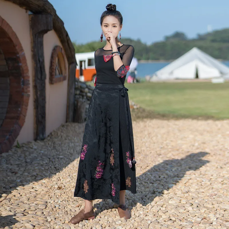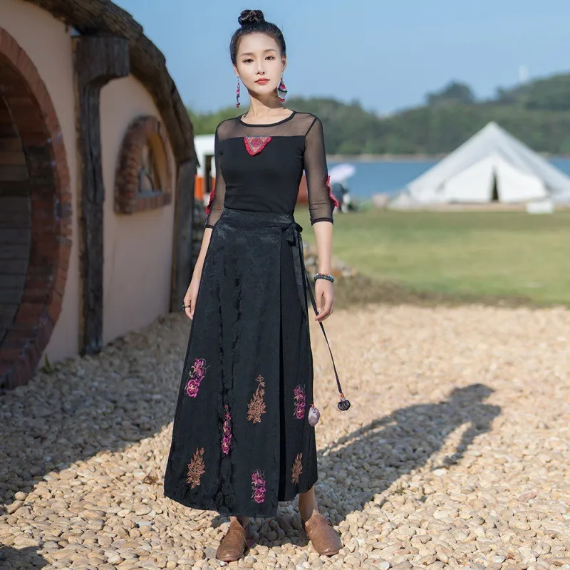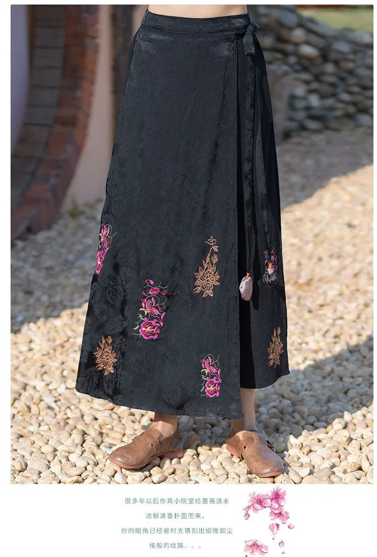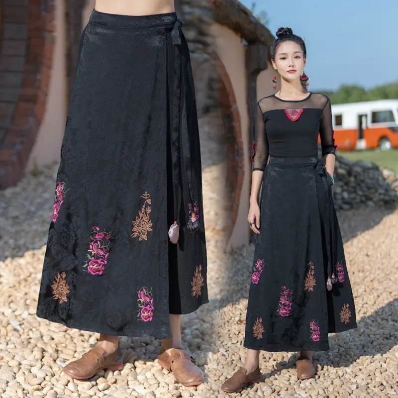 衣都精品- 2023新款民族風繡花系帶鬆緊腰提花半身裙
