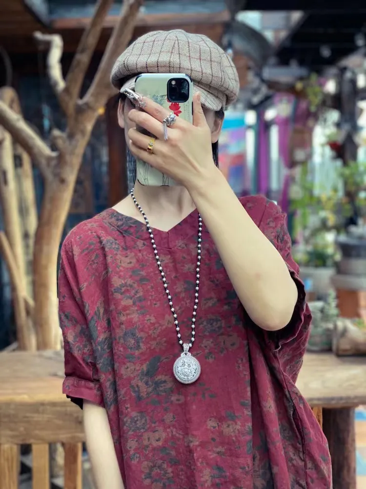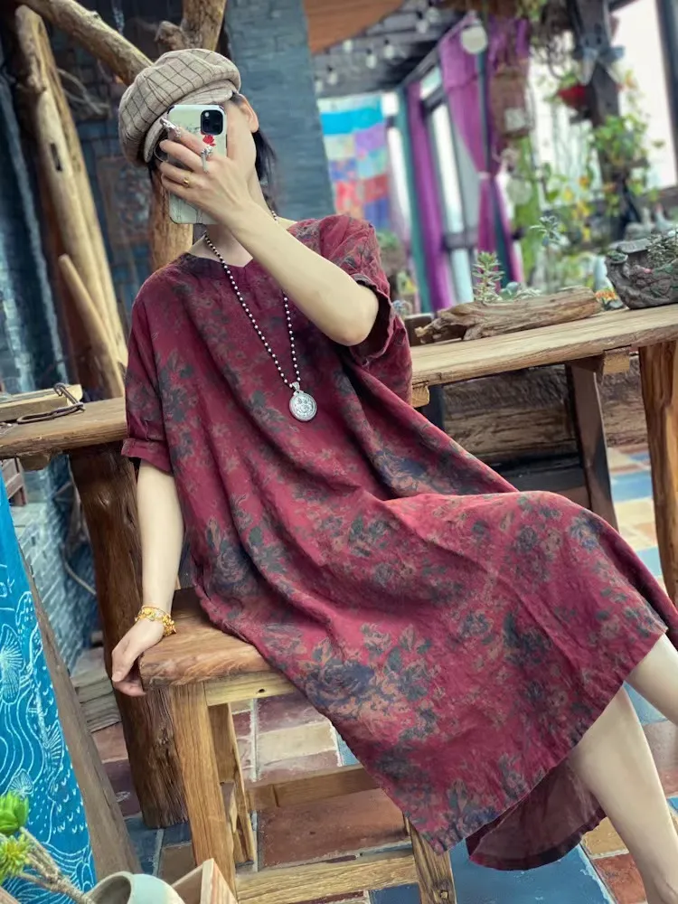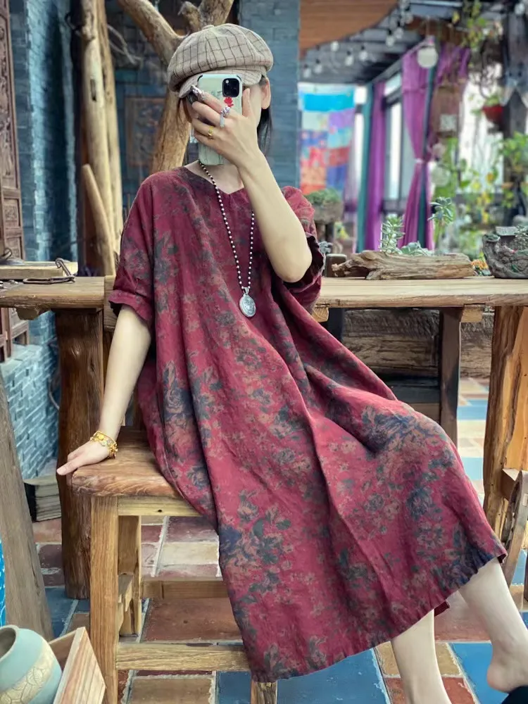 衣都精品- 2023新款復古仿香雲紗印花V領短袖連衣裙