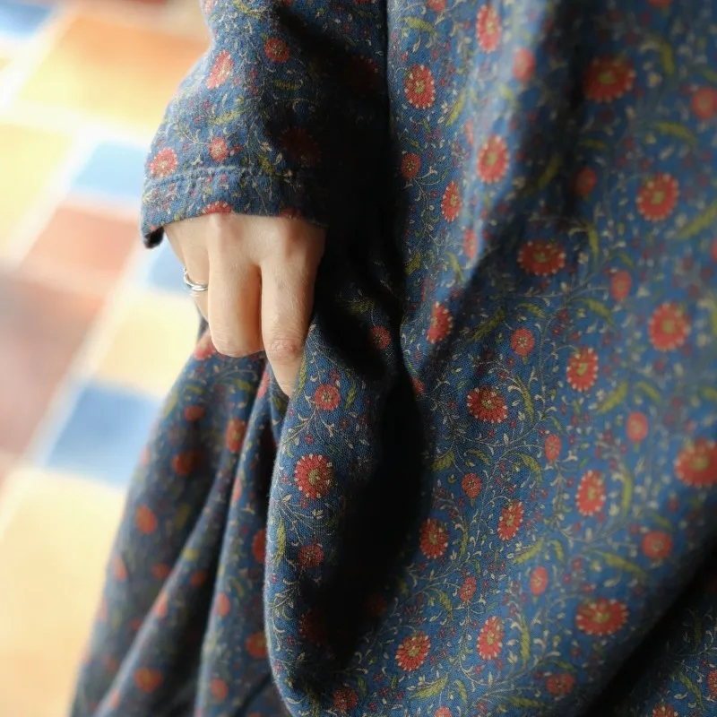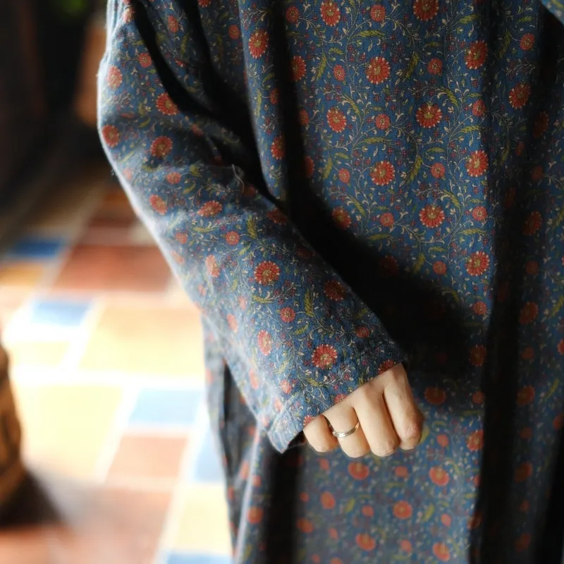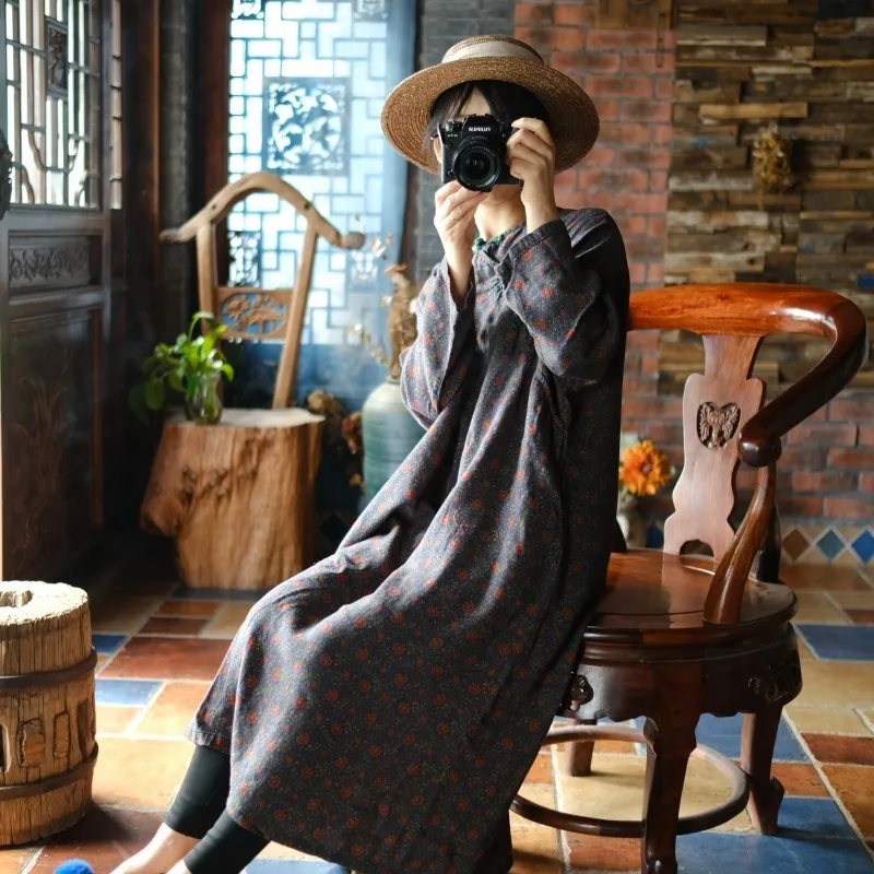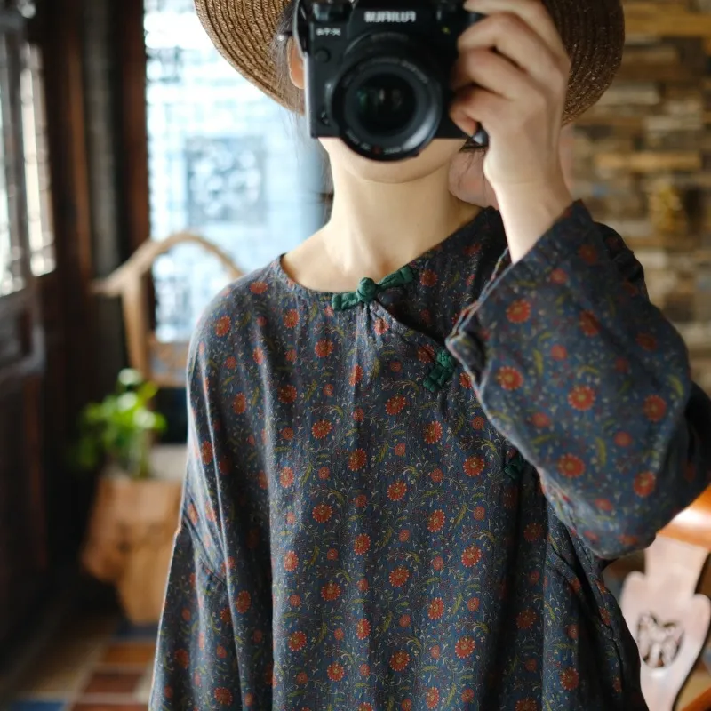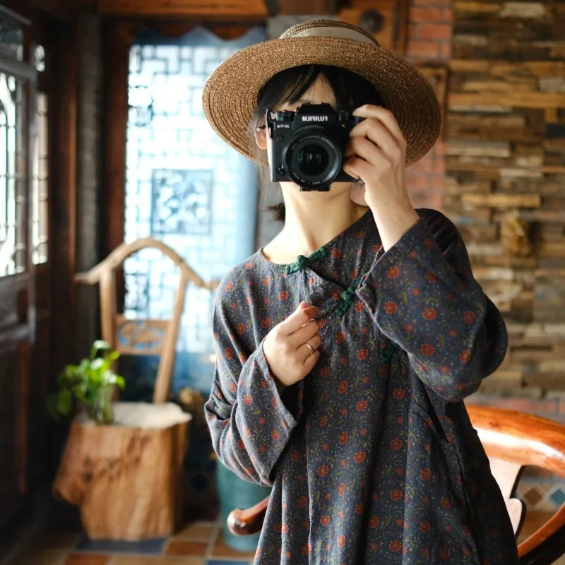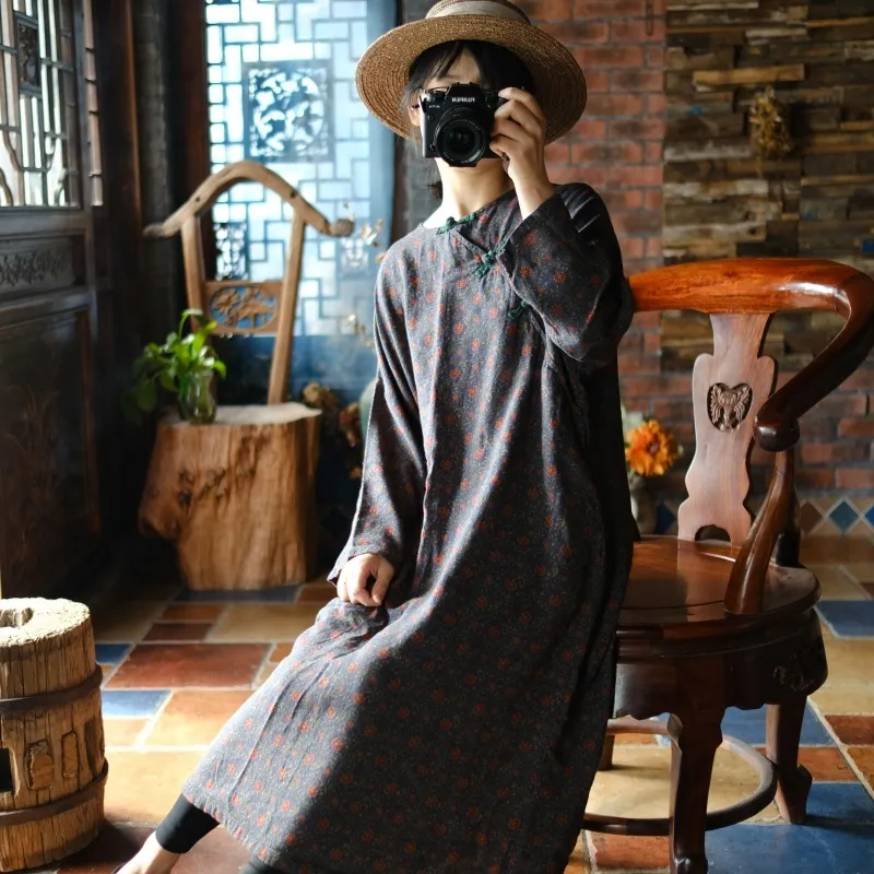 衣都精品- 2023新款復古雙層棉紗寬鬆盤扣斜襟連衣裙