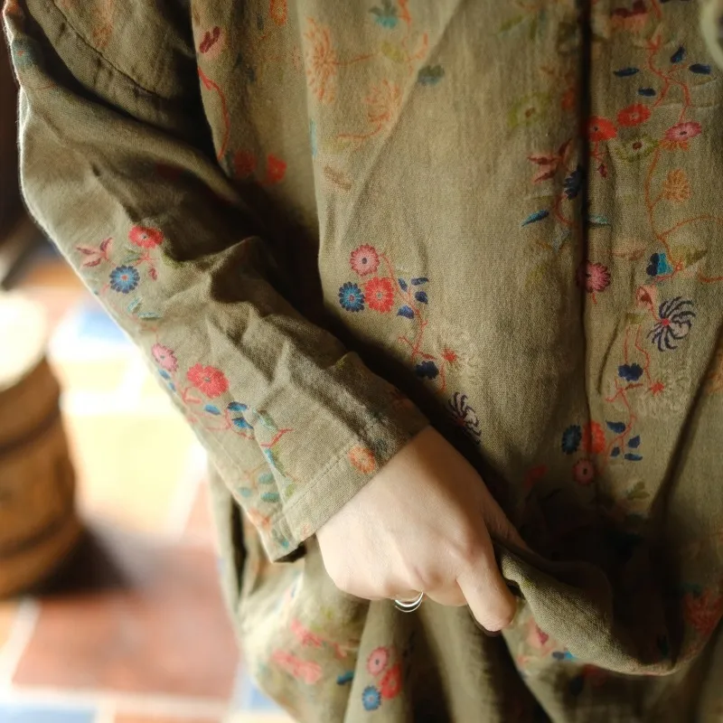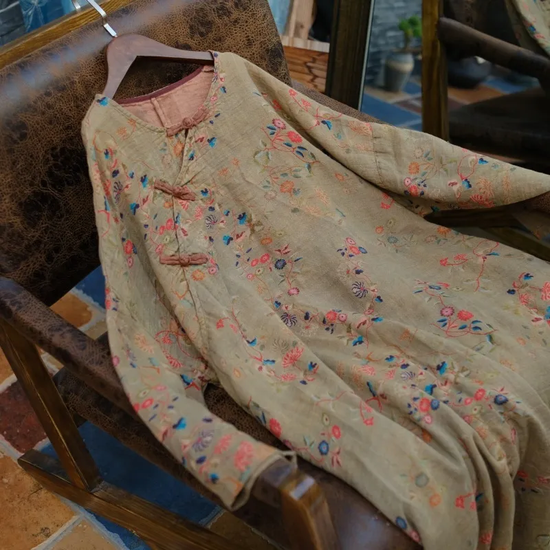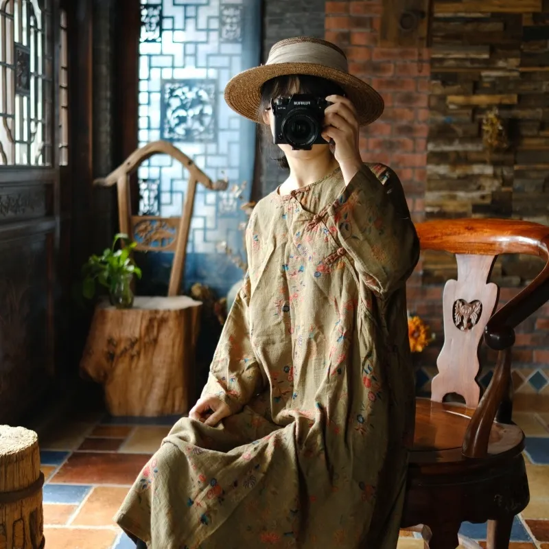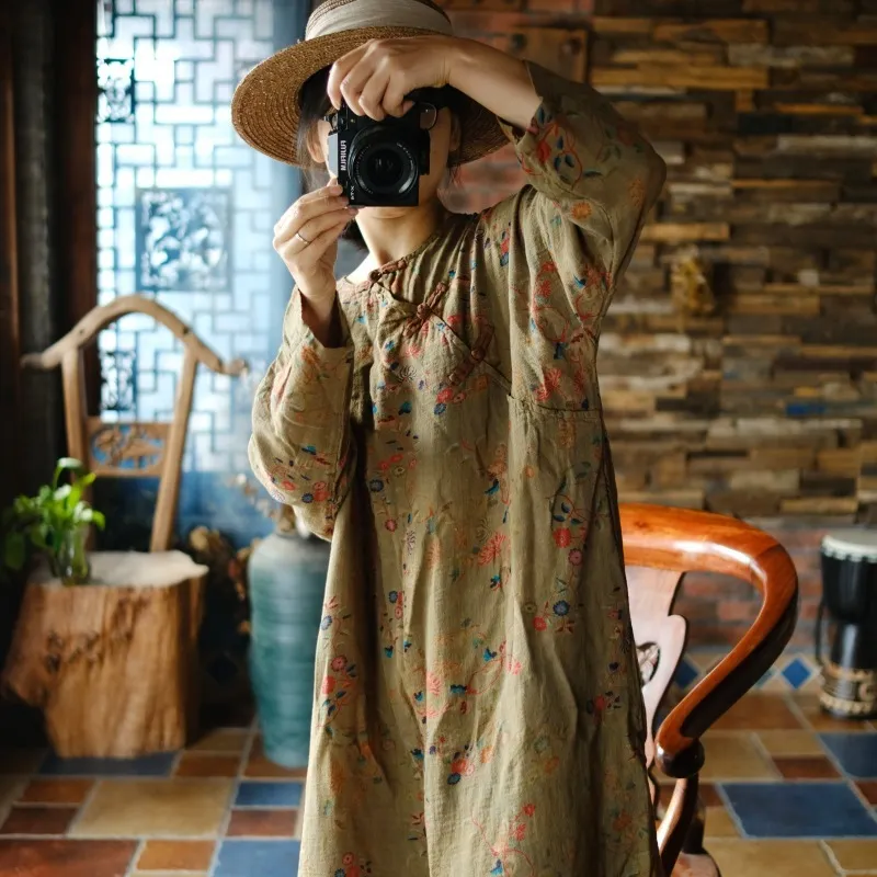 衣都精品- 2023新款復古舊感雙層棉紗寬鬆盤扣連衣裙