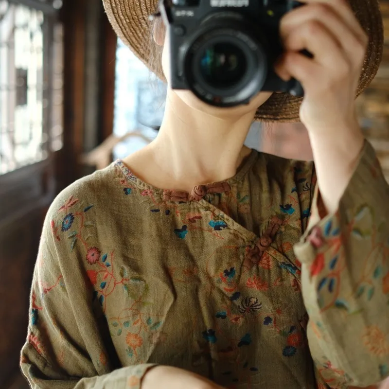衣都精品- 2023新款復古雙層棉紗寬鬆盤扣斜襟連衣裙