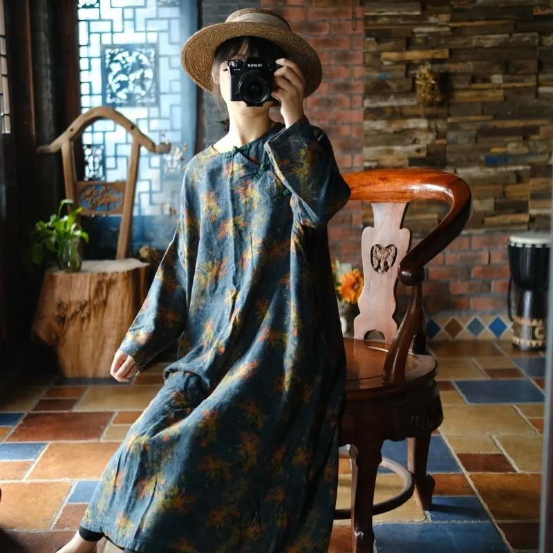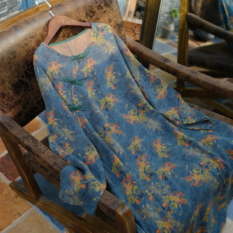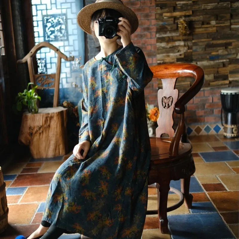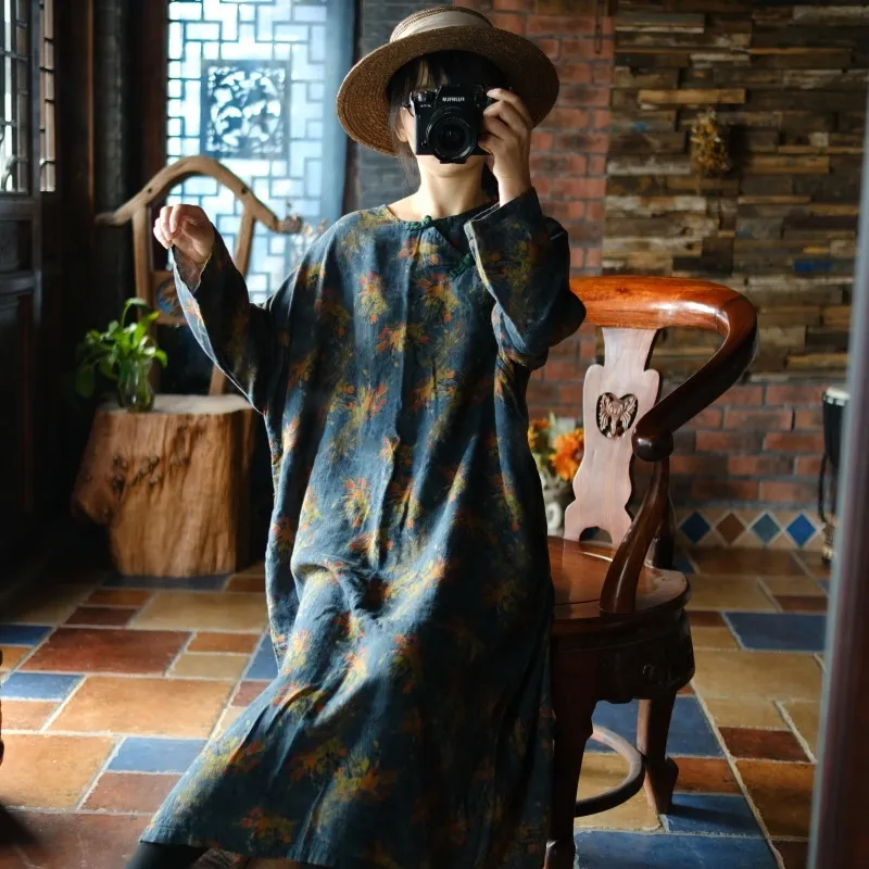 衣都精品- 2023新款復古寬鬆盤扣斜襟花袍連衣裙