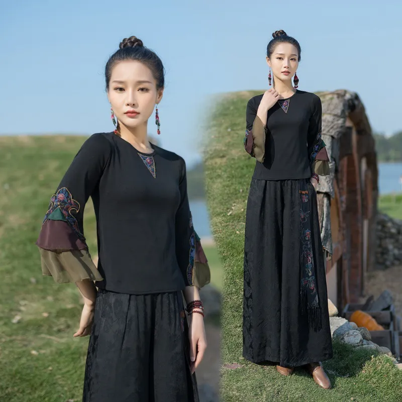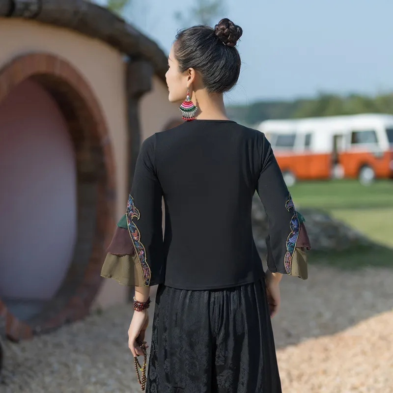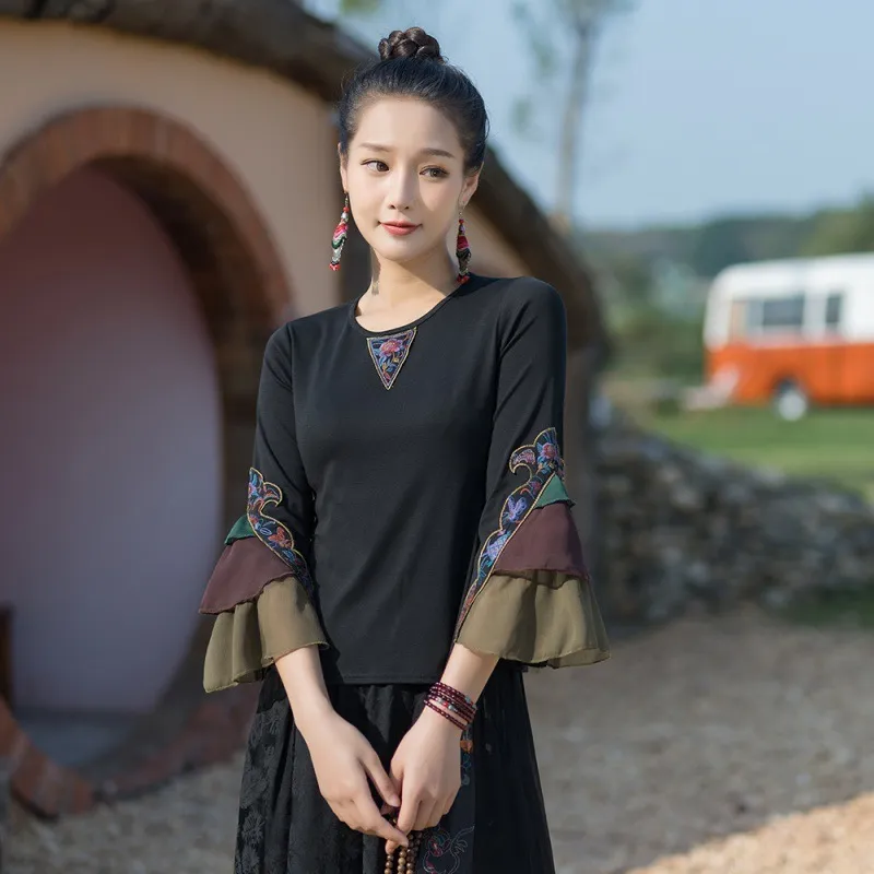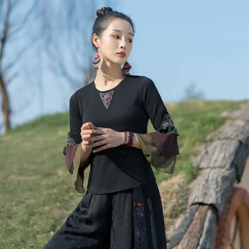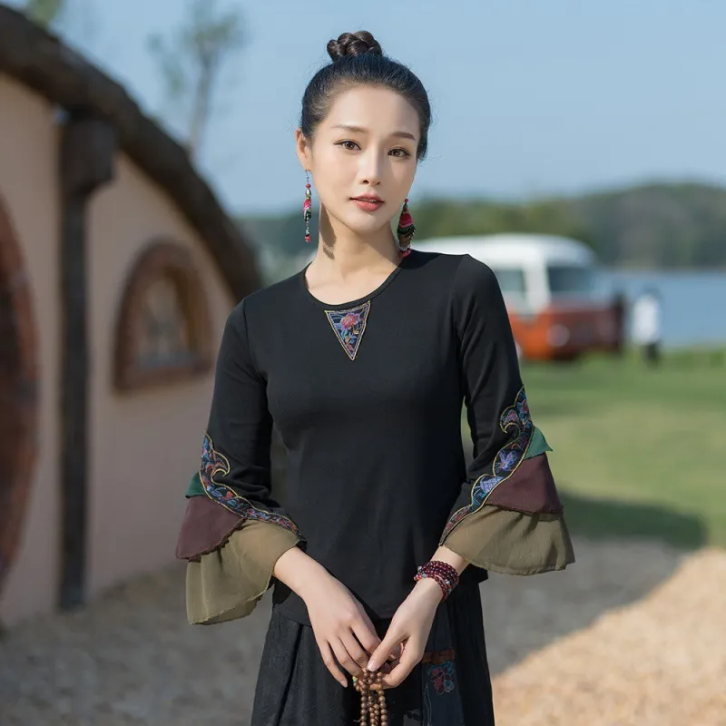 衣都精品- 2023新款民族風繡花圓領喇叭袖上衣