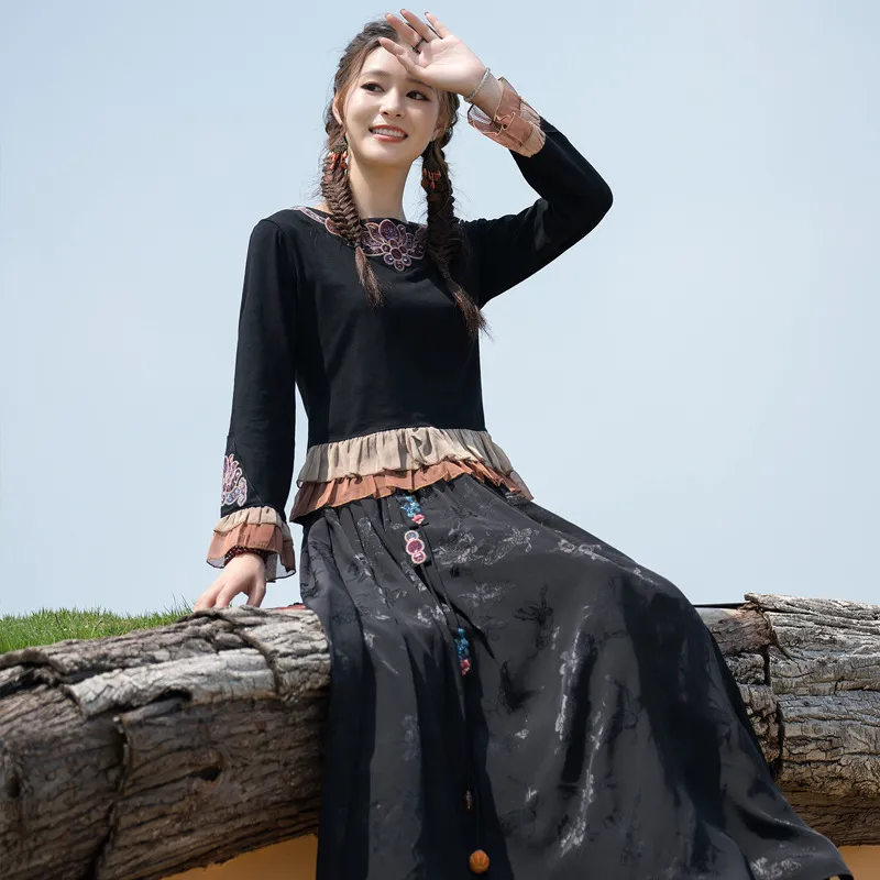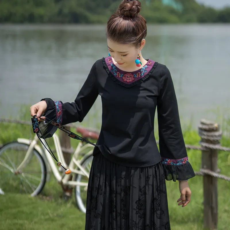 衣都精品- 2023新款民族風繡花圓領喇叭袖上衣