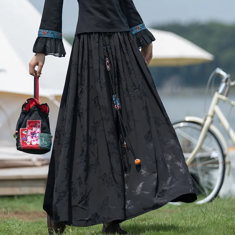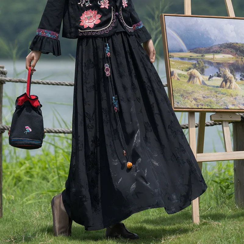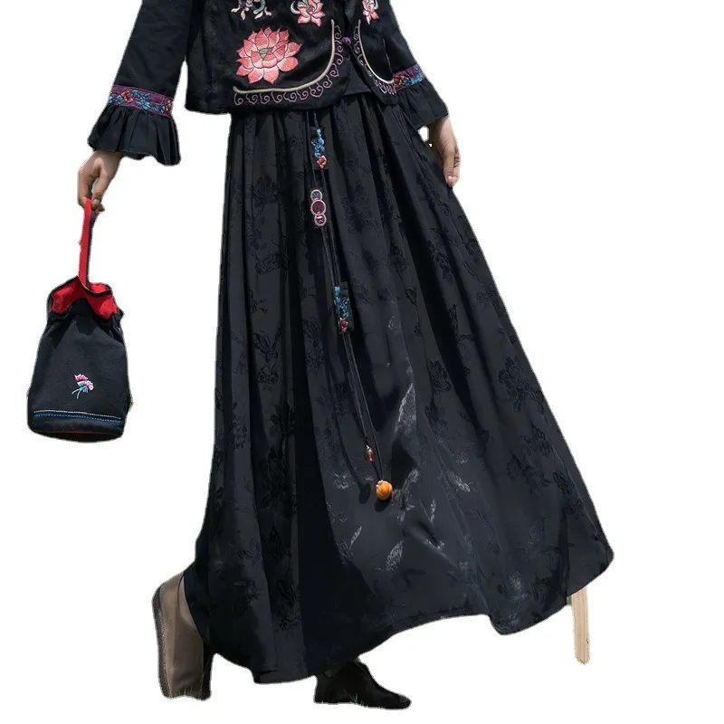 衣都精品- 2023新款民族風提花緞面流蘇飄帶半身裙