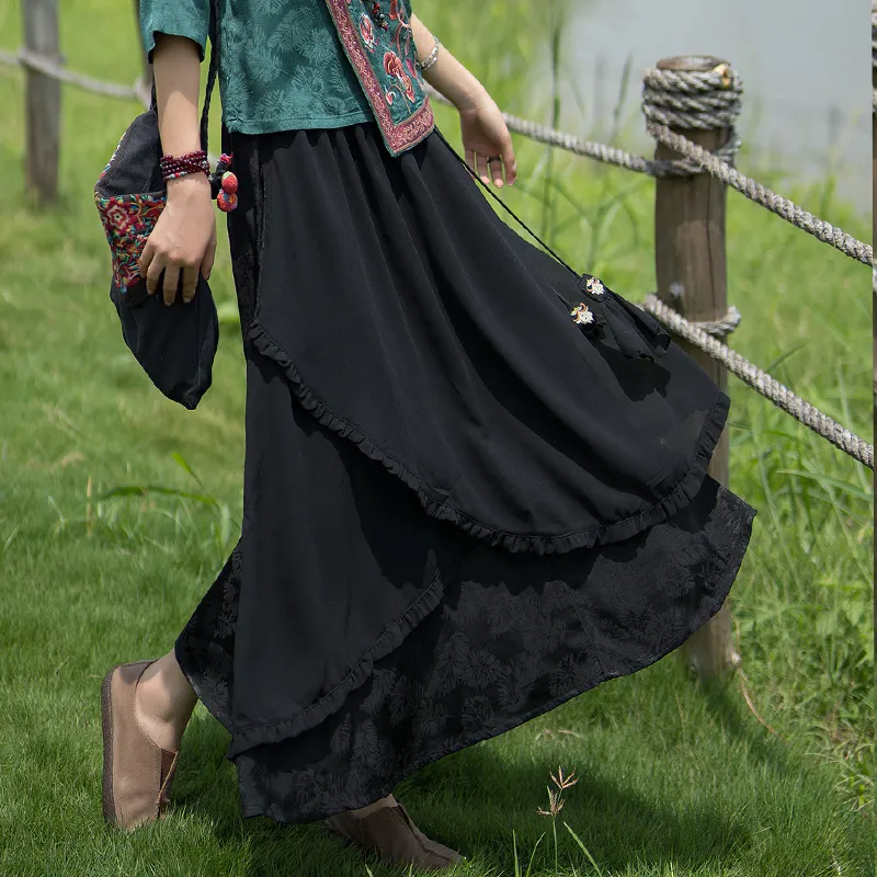 衣都精品- 2023新款民族風緞棉提花鬆緊腰半身裙