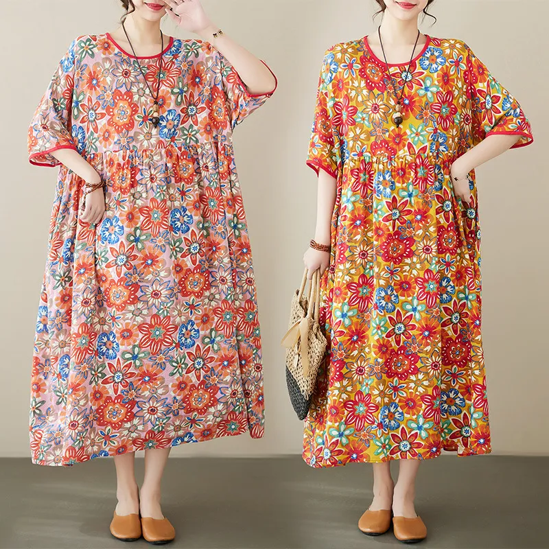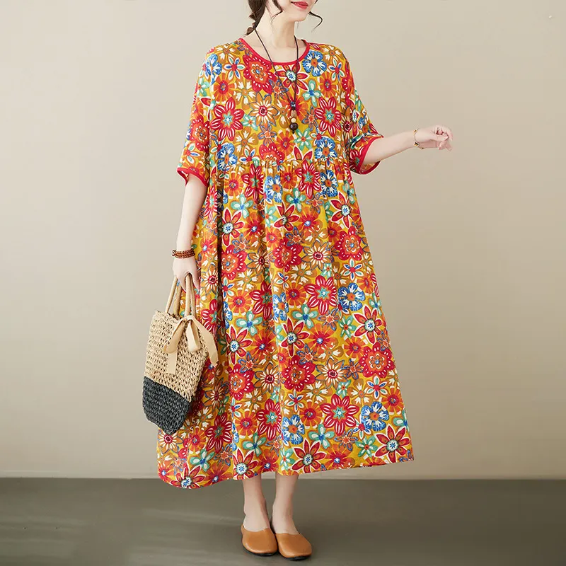 衣都精品- 2023新款民族風定位花印花短袖連衣裙
