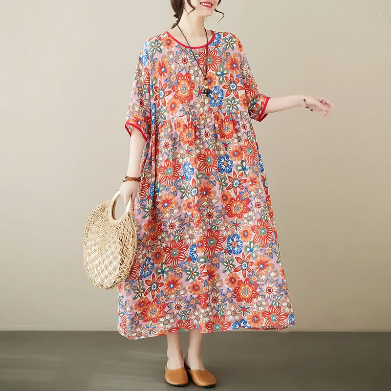衣都精品- 2023新款大碼圓領印花短袖遮肚連衣裙