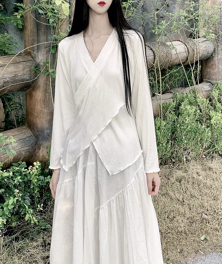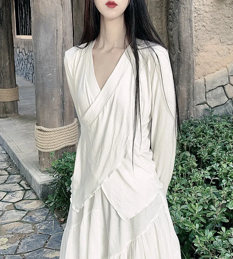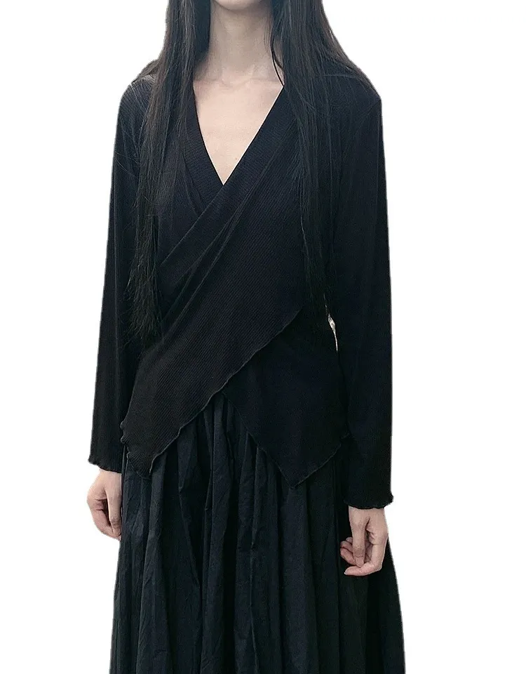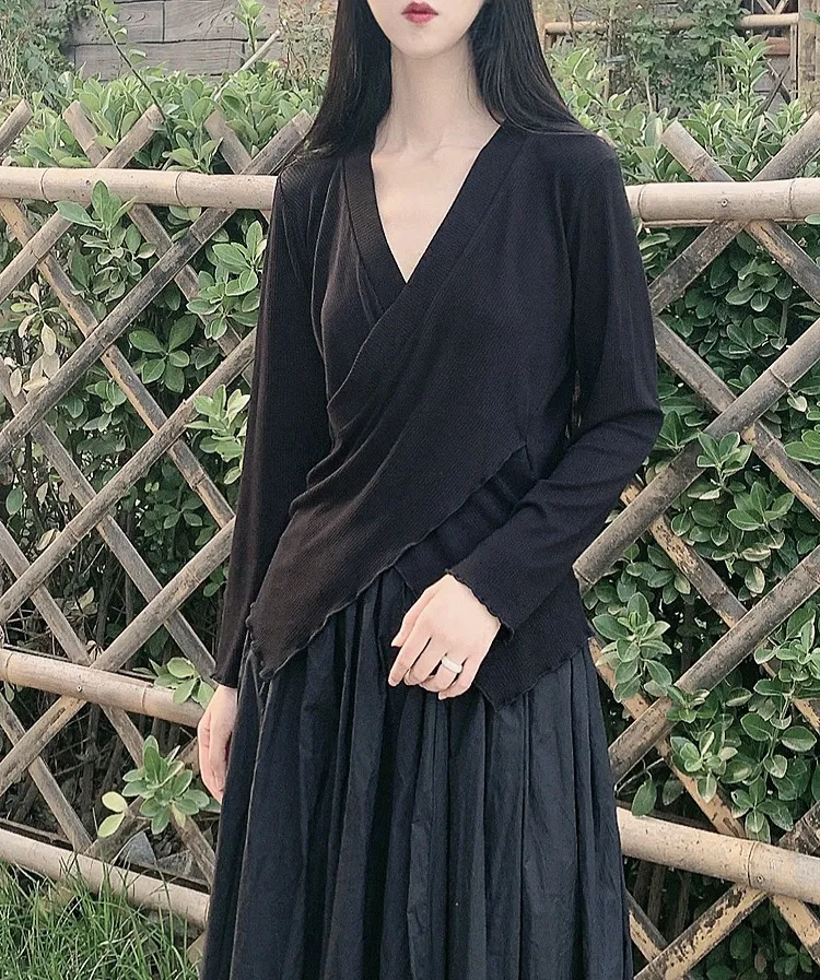 衣都精品- 2023新款交叉V領設計彈力顯瘦拼接上衣