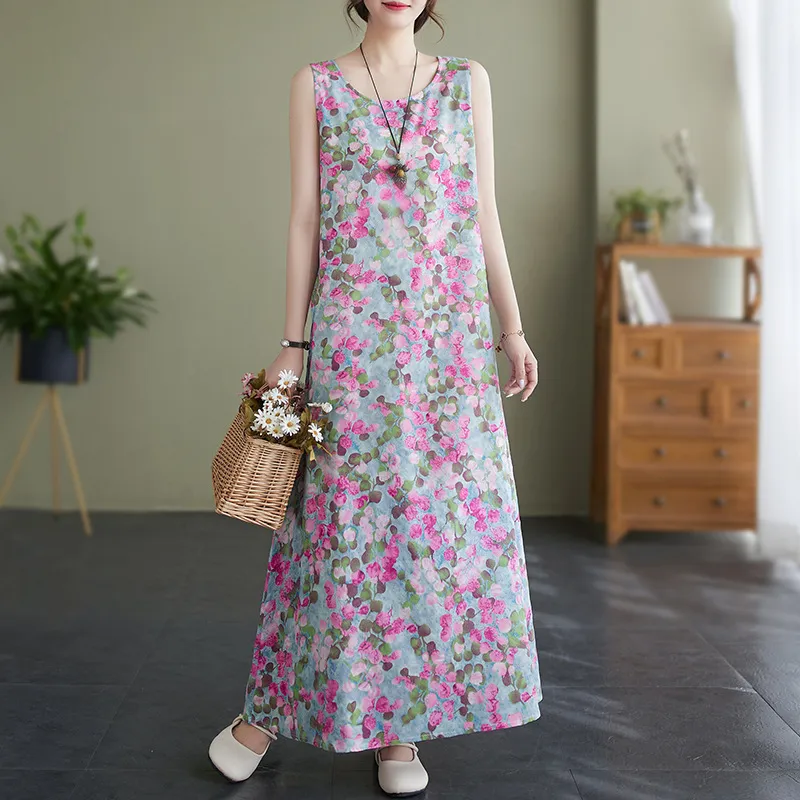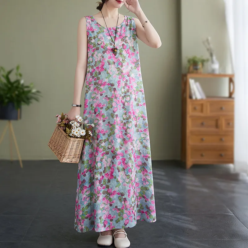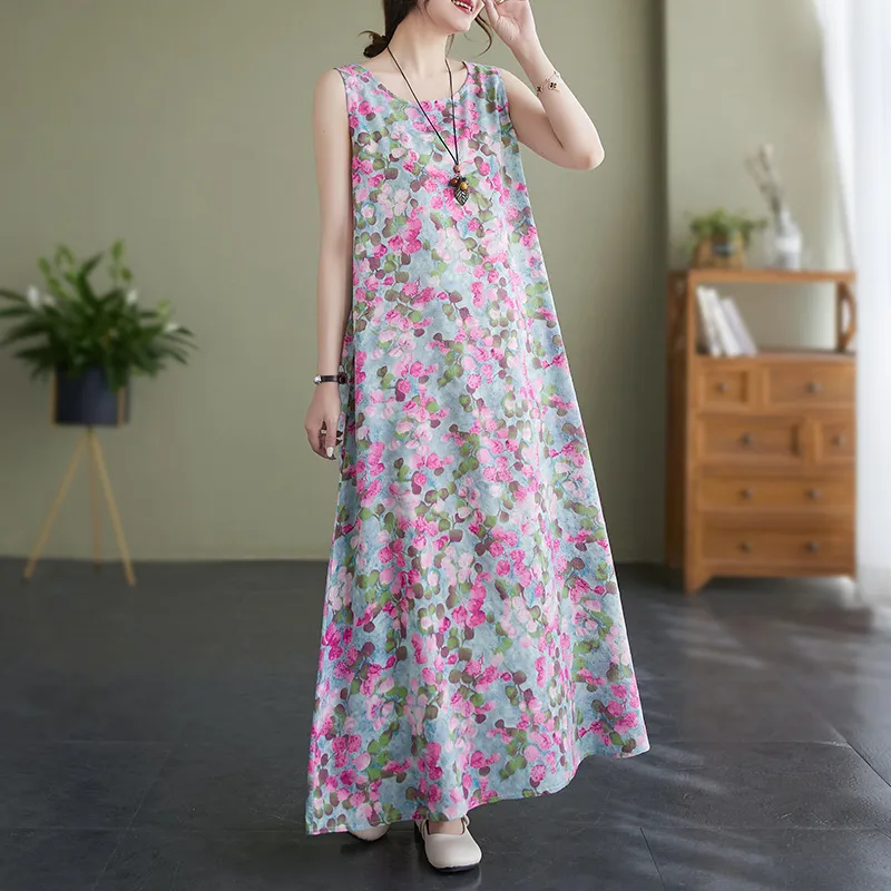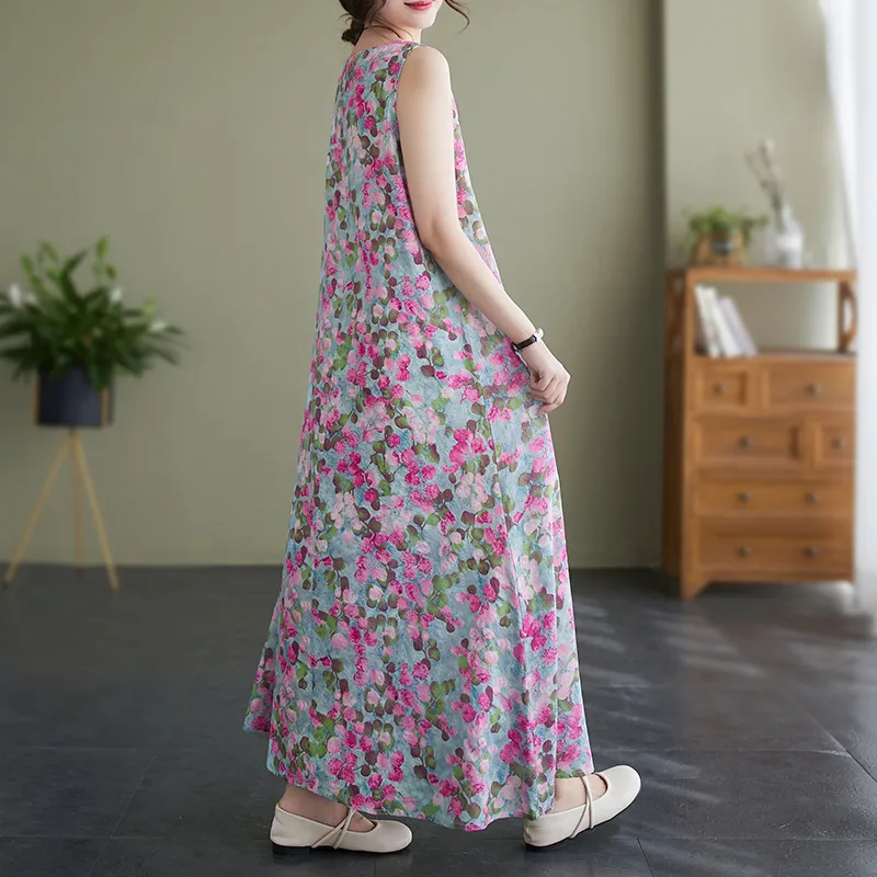 衣都精品- 2023新款文藝寬鬆印花無袖背心連衣裙