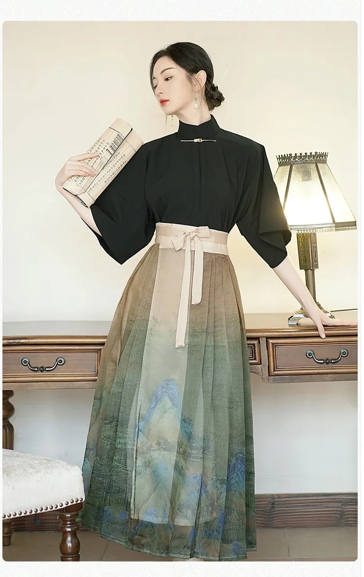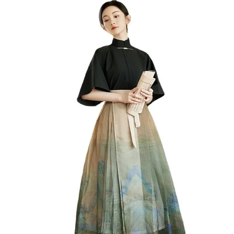衣都精品- 2023新款中國風一字扣短袖襯衫+印花馬面裙套裝
