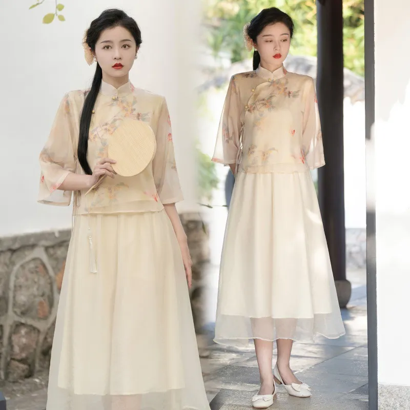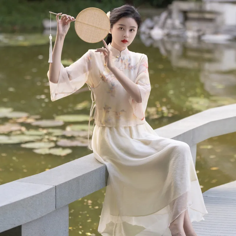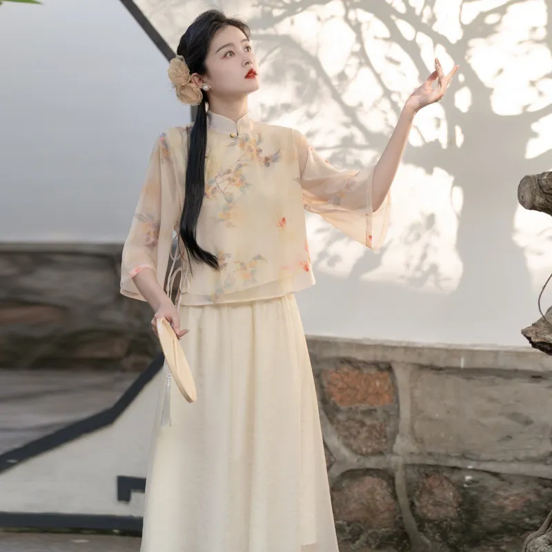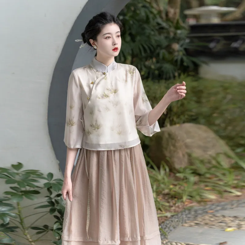 衣都精品- 2023新款中國風一字扣短袖襯衫+印花馬面裙套裝