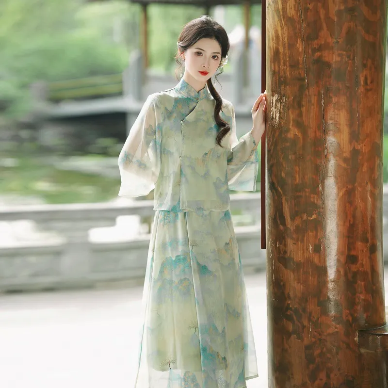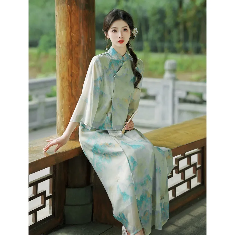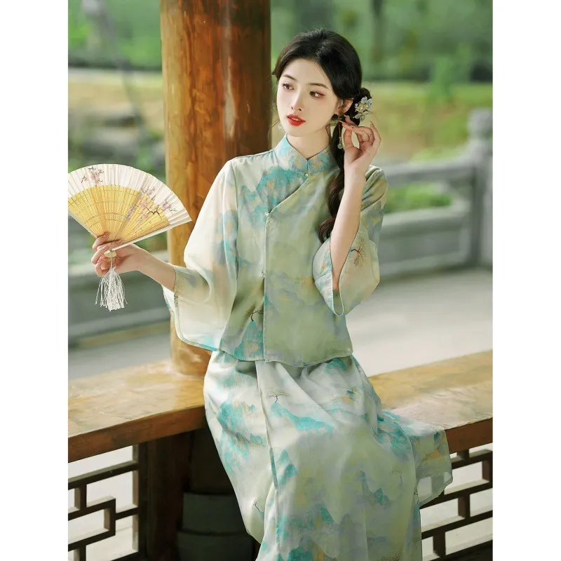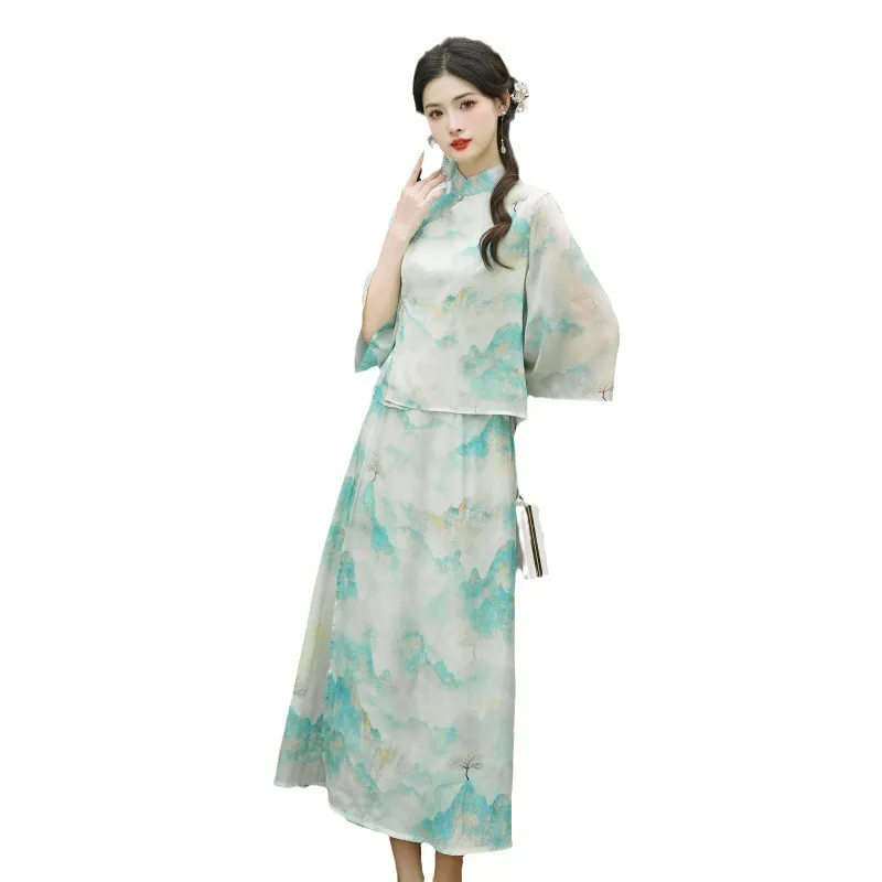 衣都精品- 2023新款禪意風文藝七分袖茶服上衣+半身裙套裝