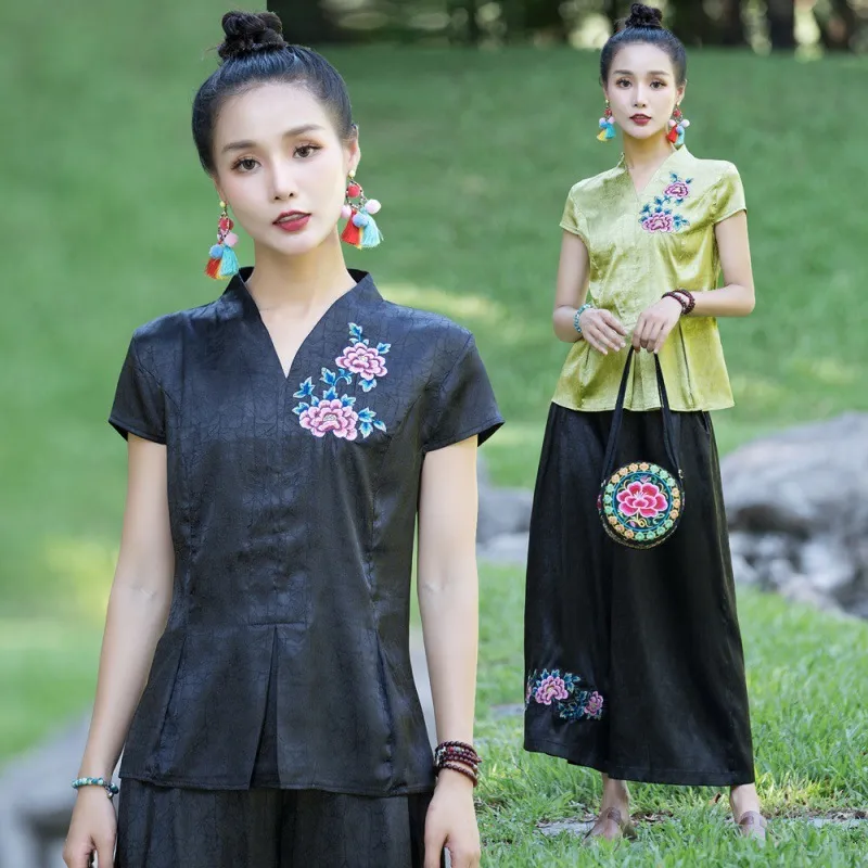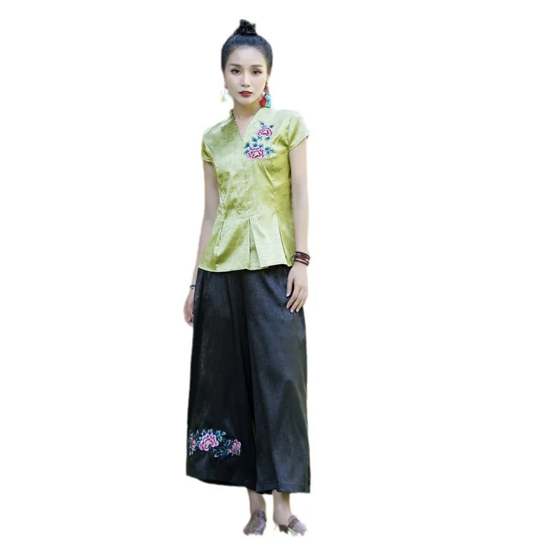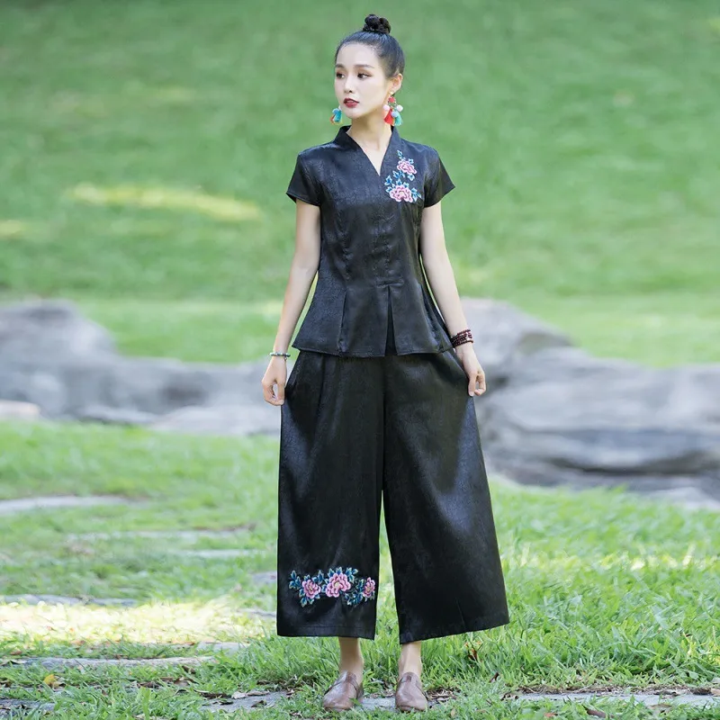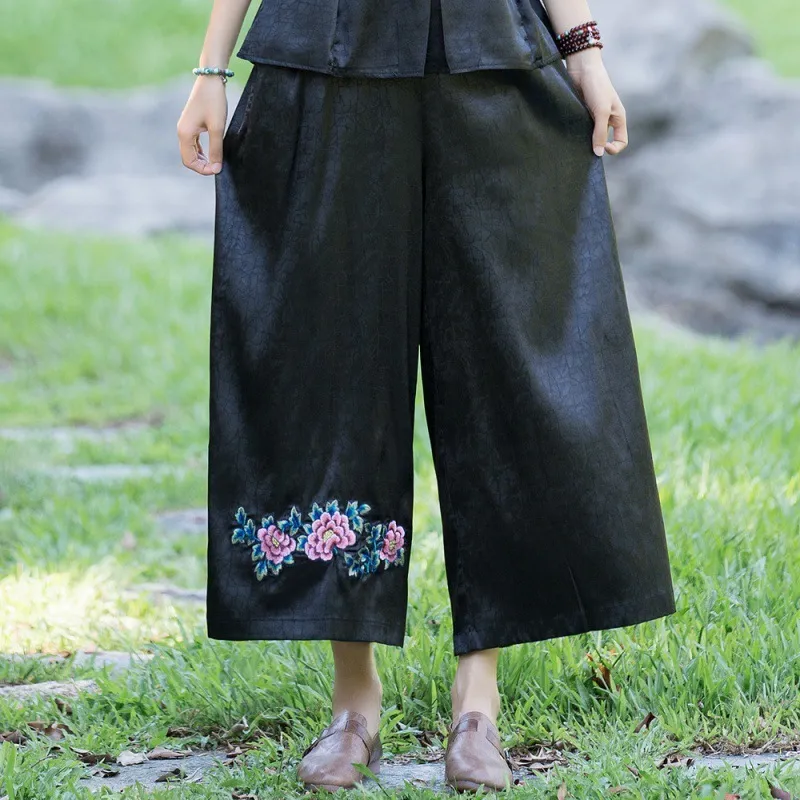 衣都精品- 2023新款民族風繡花緞面鬆緊腰闊腿褲