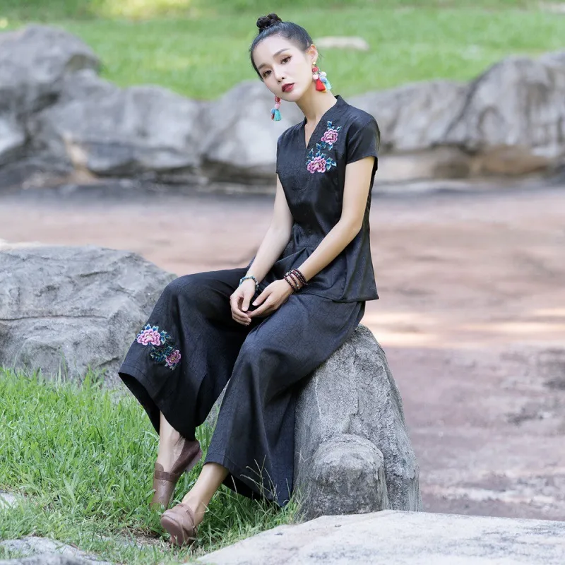 衣都精品- 2023新款民族風寬鬆繡花休閒闊腿褲