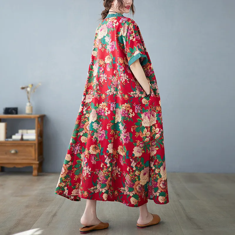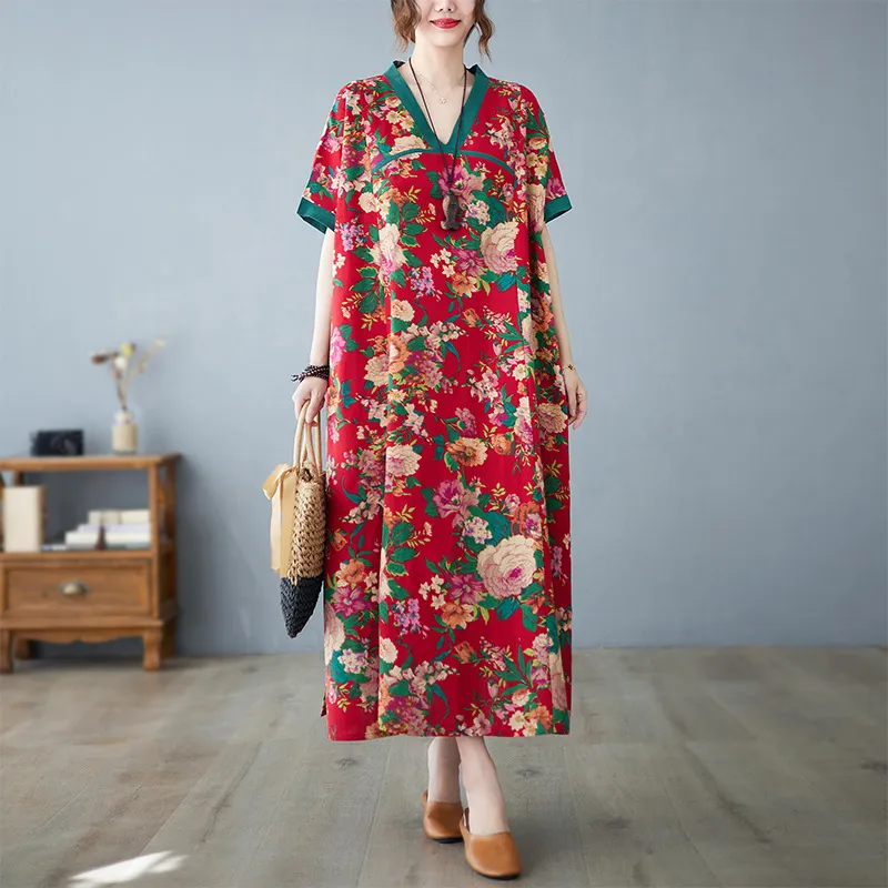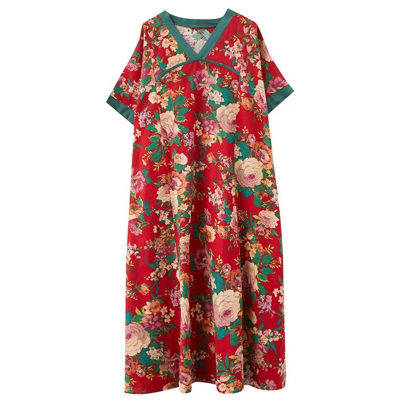 衣都精品- 2023新款文藝V領大碼印花短袖遮肚連衣裙