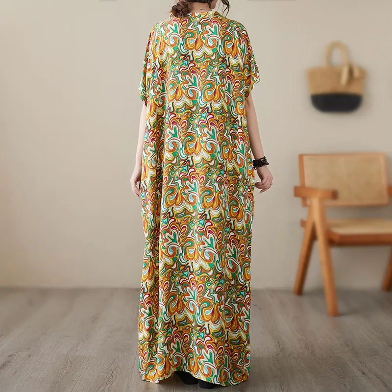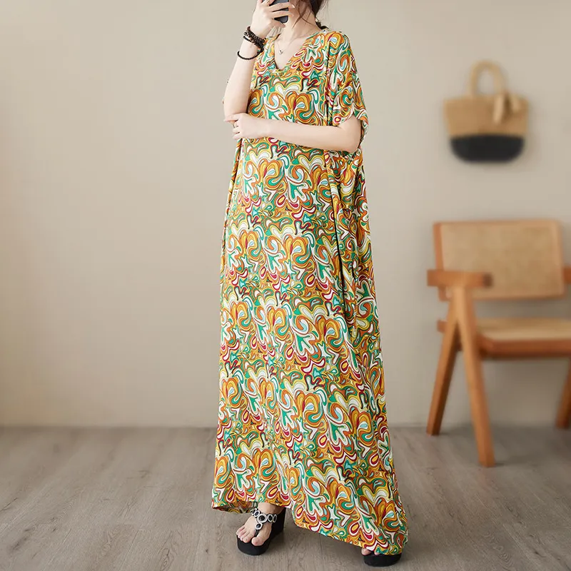 衣都精品- 2023新款文藝V領大碼印花加大寬鬆連衣裙
