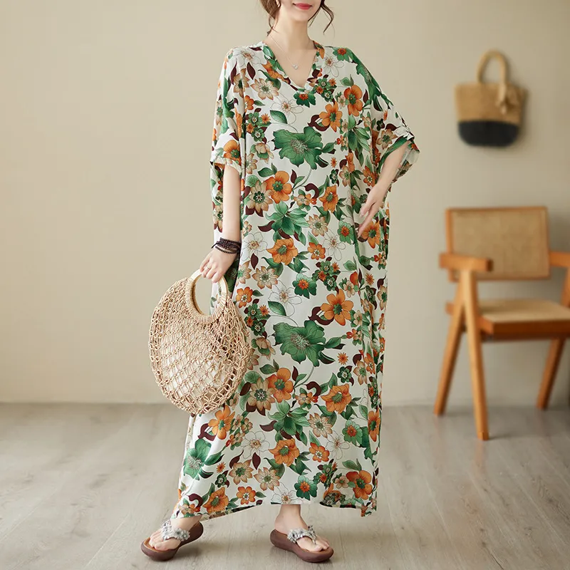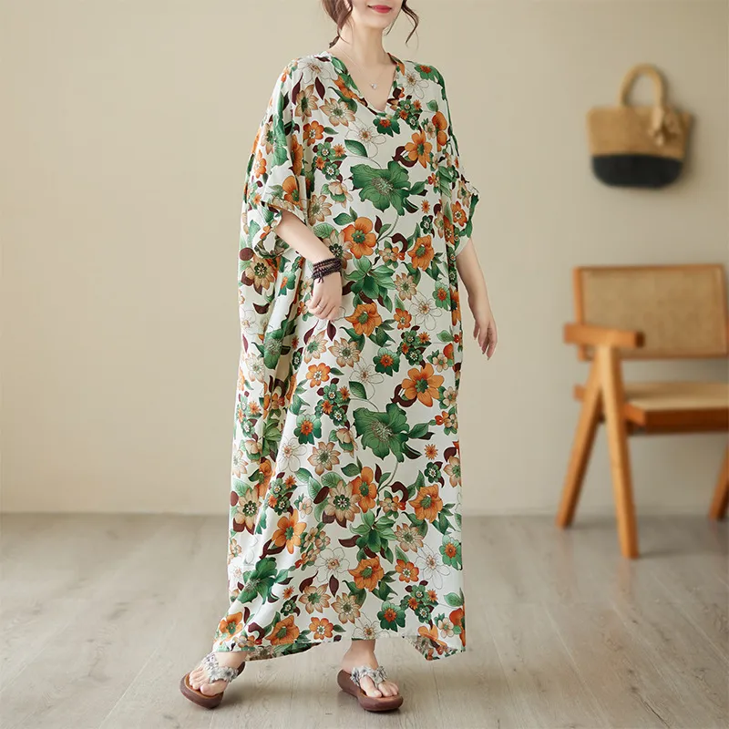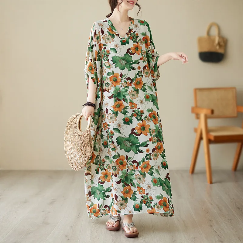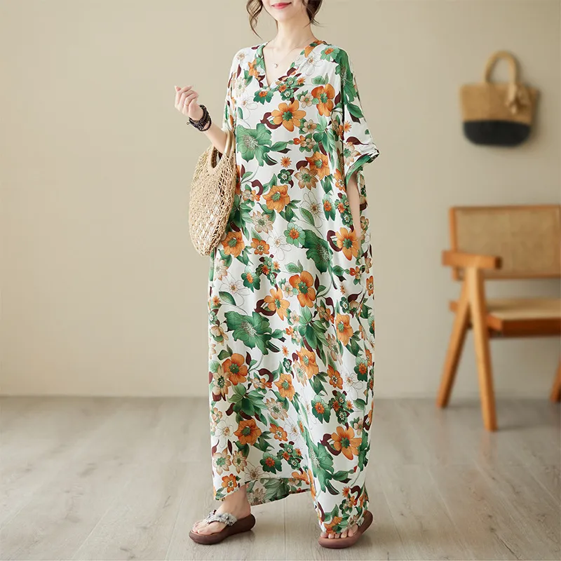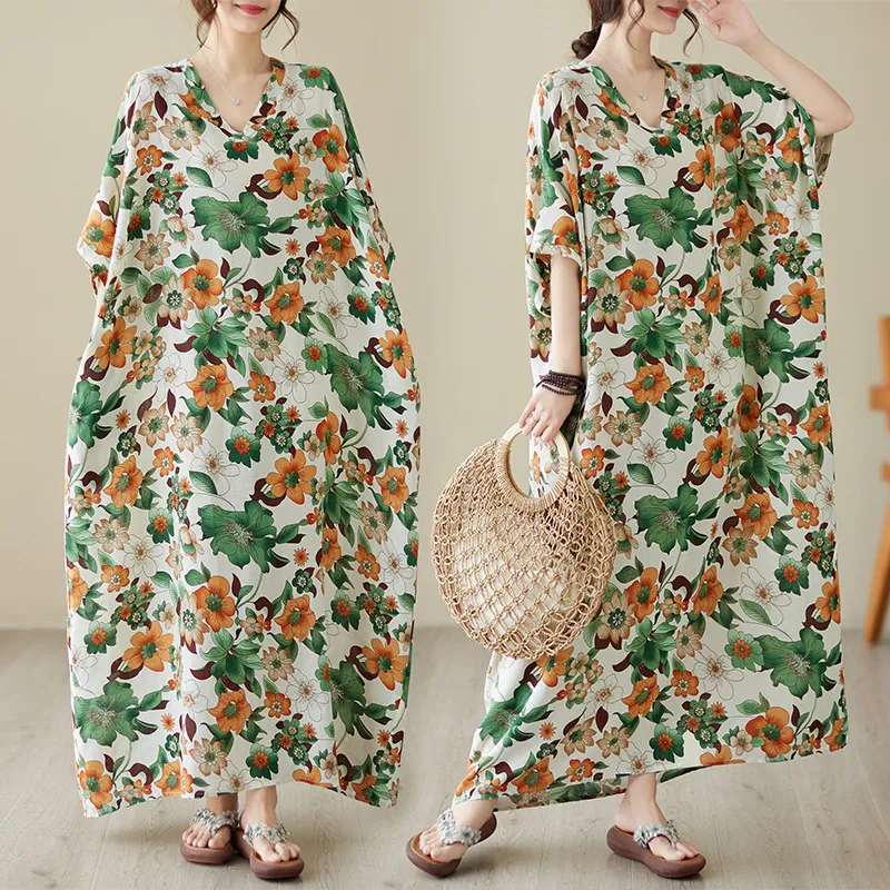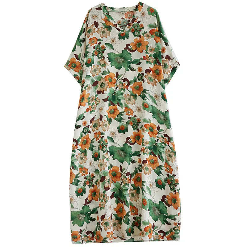 衣都精品- 2023新款文藝V領大碼印花加大寬鬆連衣裙