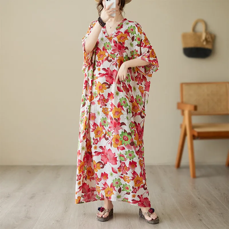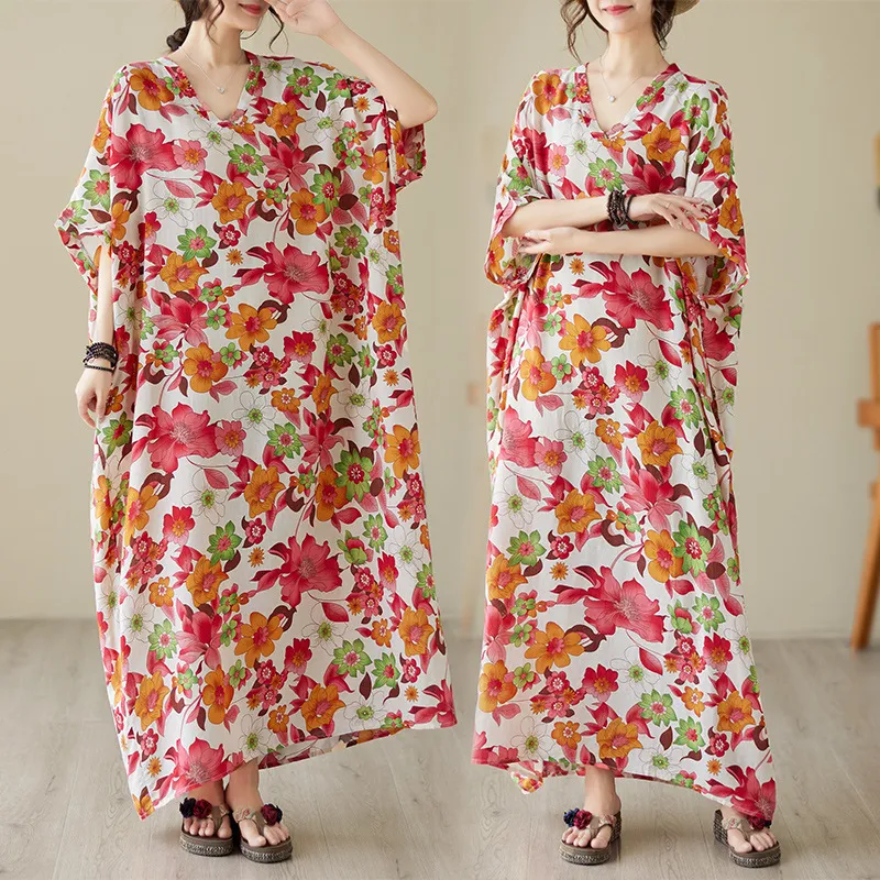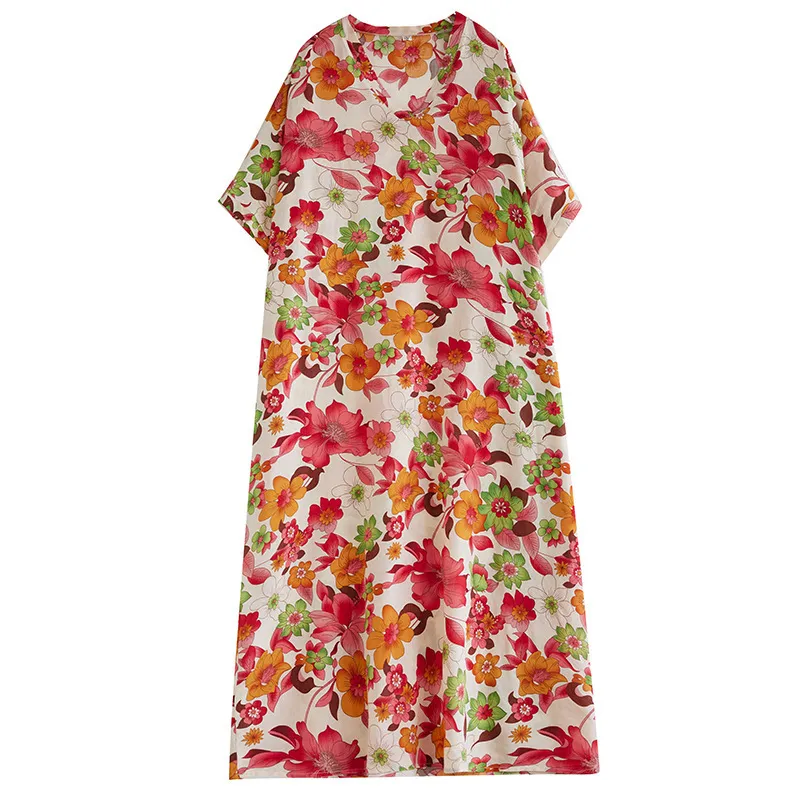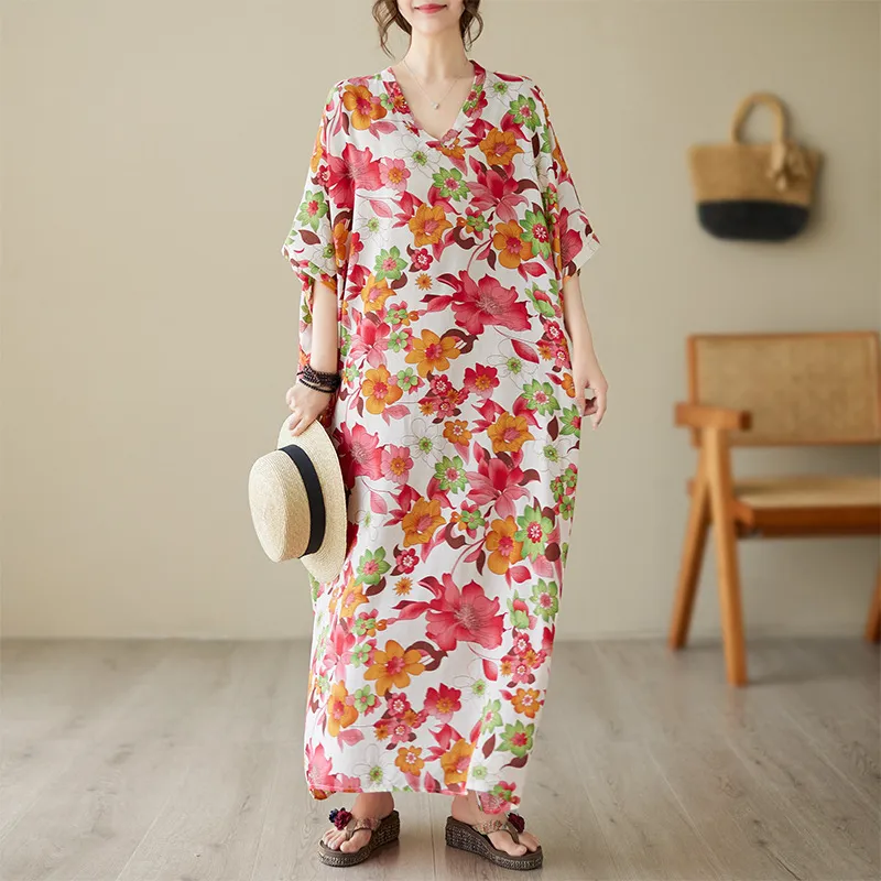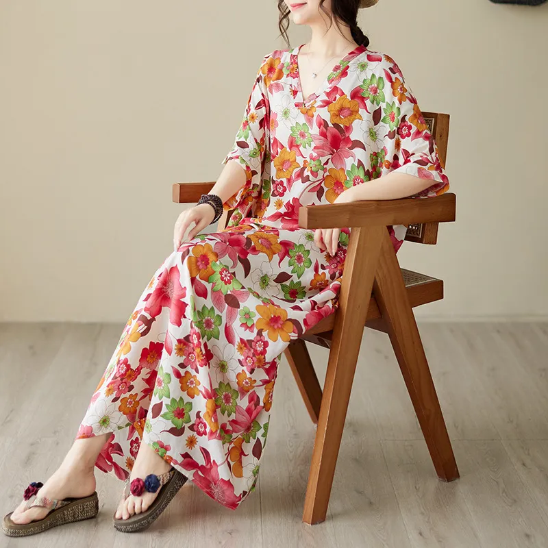 衣都精品- 2023新款文藝V領大碼印花加大寬鬆連衣裙