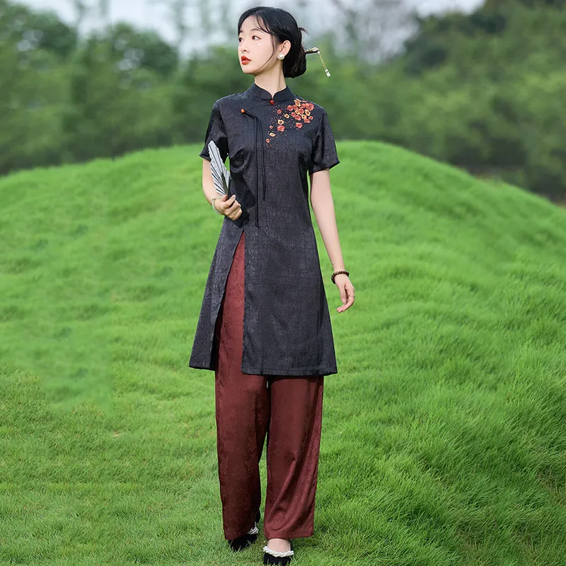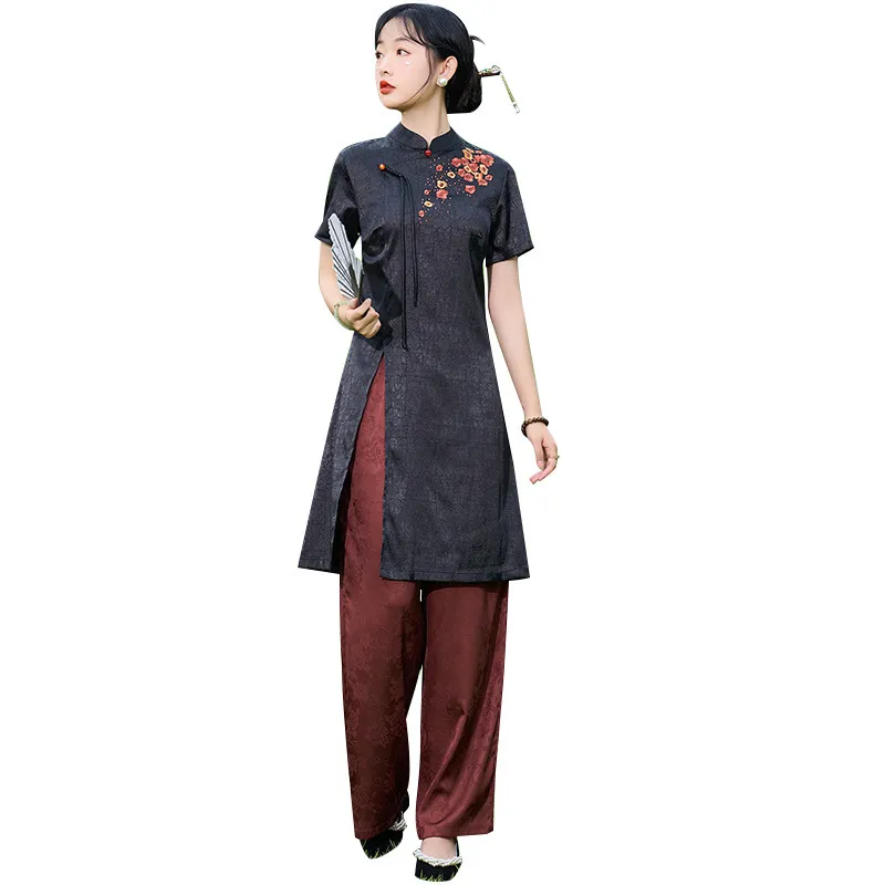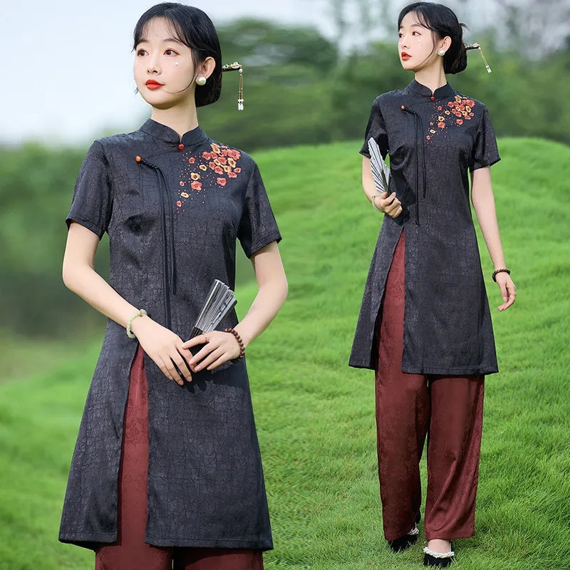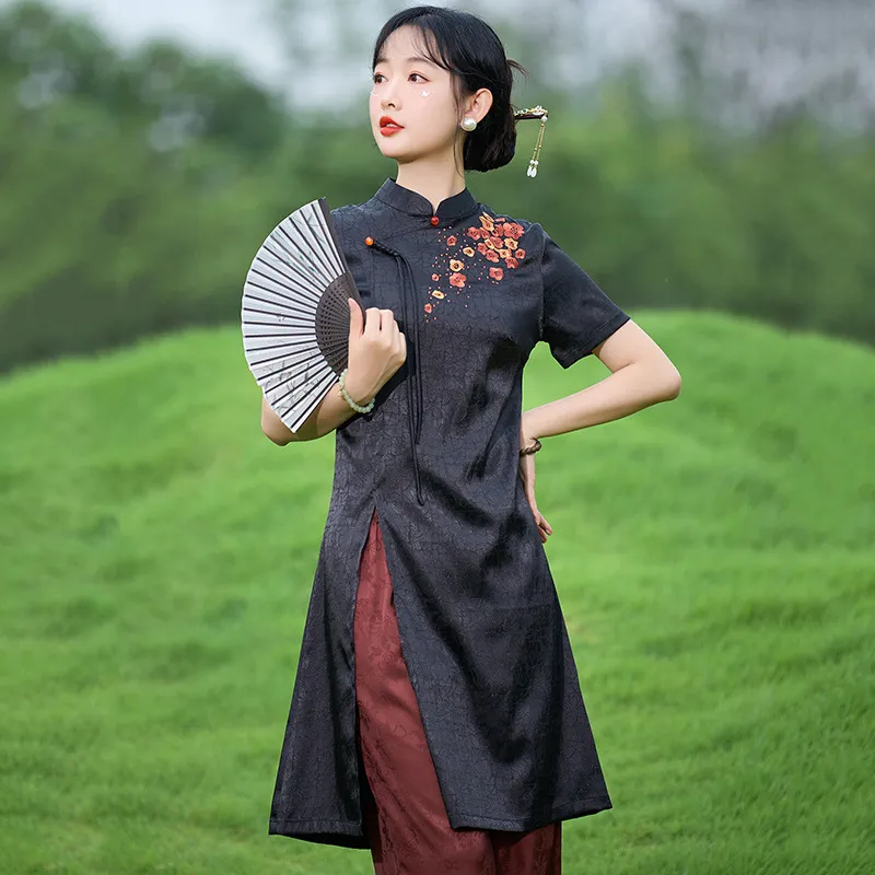 衣都精品- 2023新款中式改良旗袍刺繡中長款立領盤扣上衣